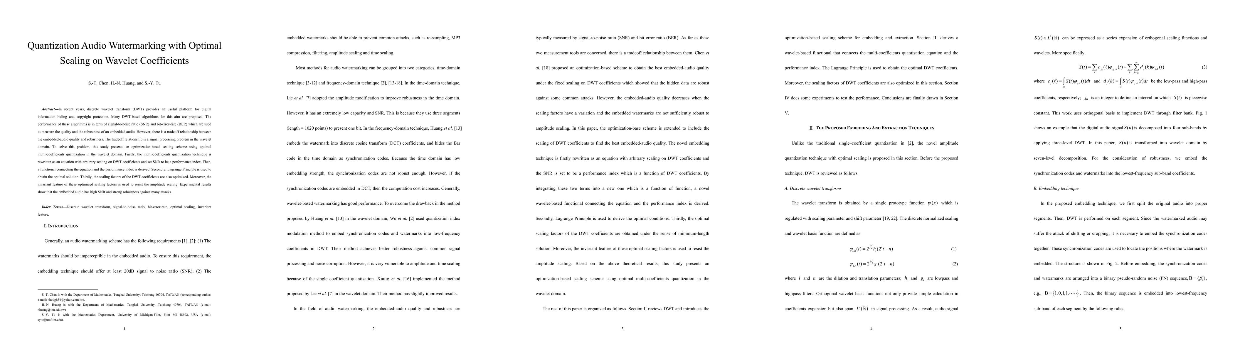 In recent years, discrete wavelet transform (DWT) provides an useful platform for digital information hiding and copyright protection. Many DWT-based algorithms for this aim are proposed. The performance of these algorithms is in term of signal-to-noise ratio (SNR) and bit-error-rate (BER) which are used to measure the quality and the robustness of an embedded audio. However, there is a tradeoff relationship between the embedded-audio quality and robustness. The tradeoff relationship is a signal processing problem in the wavelet domain. To solve this problem, this study presents an optimization-based scaling scheme using optimal multi-coefficients quantization in the wavelet domain. Firstly, the multi-coefficients quantization technique is rewritten as an equation with arbitrary scaling on DWT coefficients and set SNR to be a performance index. Then, a functional connecting the equation and the performance index is derived. Secondly, Lagrange Principle is used to obtain the optimal solution. Thirdly, the scaling factors of the DWT coefficients are also optimized. Moreover, the invariant feature of these optimized scaling factors is used to resist the amplitude scaling. Experimental results show that the embedded audio has high SNR and strong robustness against many attacks