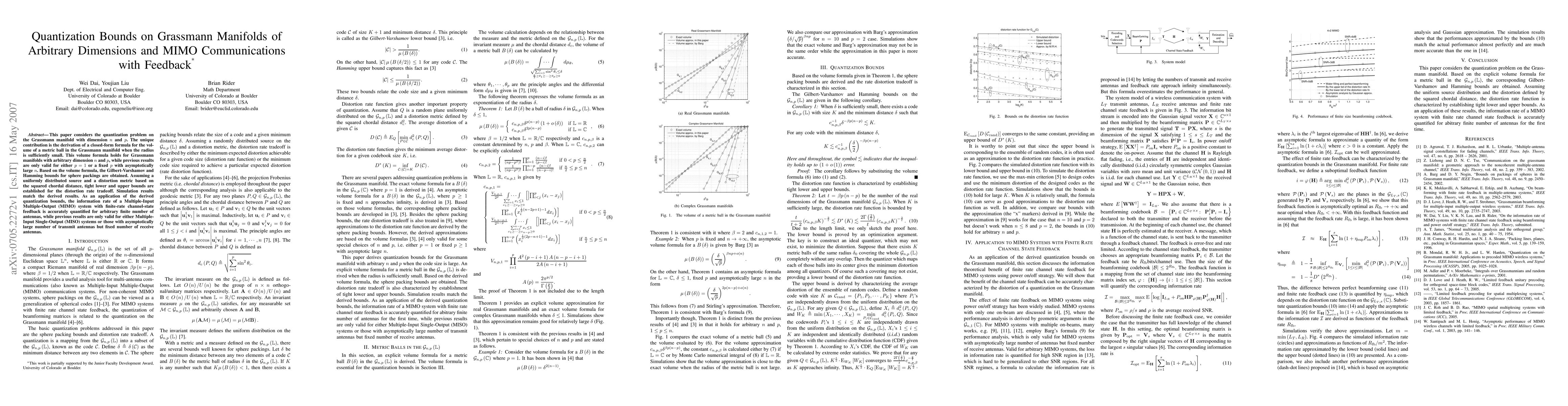 This paper derives a closed-form formula for the volume of a metric ball on the Grassmann manifold, enabling the establishment of quantization bounds for arbitrary dimensions. It provides tight bounds for the distortion rate tradeoff in MIMO systems with finite-rate channel-state feedback, extending previous results to systems with an arbitrary number of antennas.