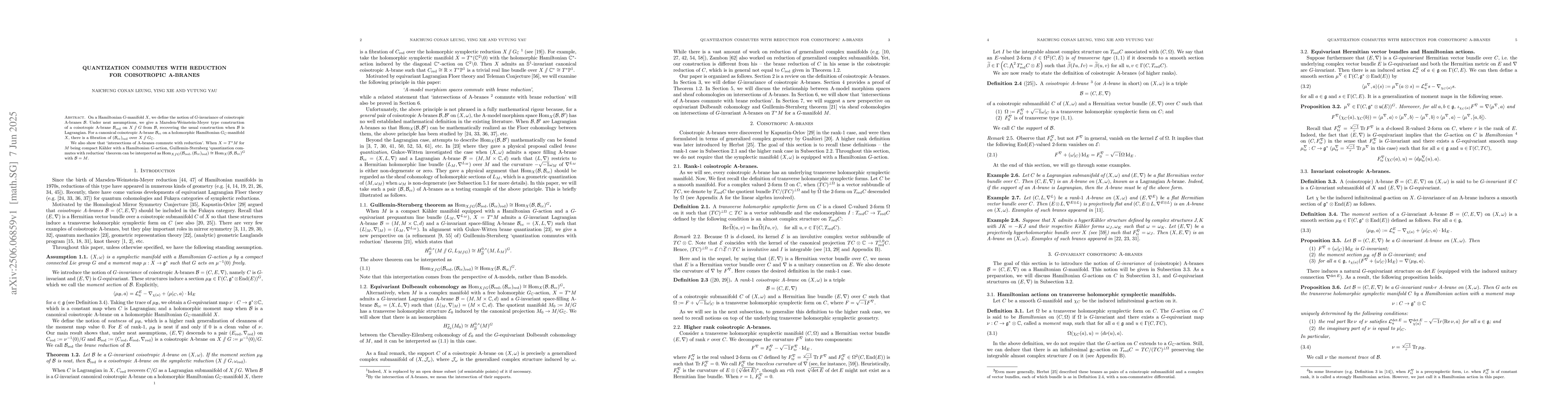 On a Hamiltonian $G$-manifold $X$, we define the notion of $G$-invariance of coisotropic A-branes $\mathcal{B}$. Under neat assumptions, we give a Marsden-Weinstein-Meyer type construction of a coisotropic A-brane $\mathcal{B}_{\operatorname{red}}$ on $X // G$ from $\mathcal{B}$, recovering the usual construction when $\mathcal{B}$ is Lagrangian. For a canonical coisotropic A-brane $\mathcal{B}_{\operatorname{cc}}$ on a holomorphic Hamiltonian $G_\mathbb{C}$-manifold $X$, there is a fibration of $(\mathcal{B}_{\operatorname{cc}})_{\operatorname{red}}$ over $X // G_\mathbb{C}$. We also show that `intersections of A-branes commute with reduction'. When $X = T^*M$ for $M$ being compact K\"ahler with a Hamiltonian $G$-action, Guillemin-Sternberg `quantization commutes with reduction' theorem can be interpreted as $\operatorname{Hom}_{X // G}(\mathcal{B}_{\operatorname{red}}, (\mathcal{B}_{\operatorname{cc}})_{\operatorname{red}}) \cong \operatorname{Hom}_X(\mathcal{B}, \mathcal{B}_{\operatorname{cc}})^G$ with $\mathcal{B} = M$.