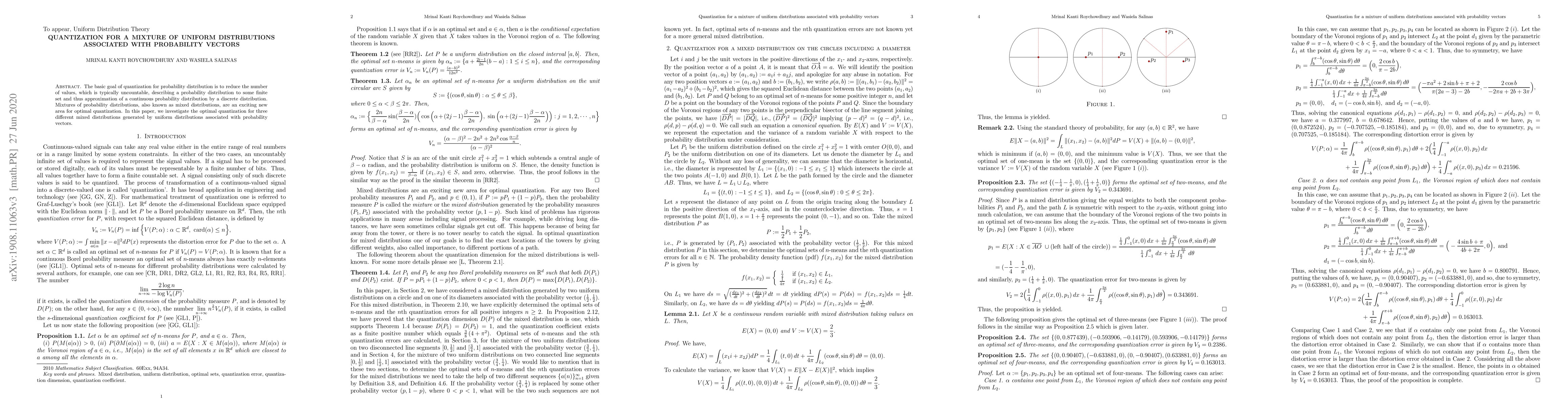 This paper explores optimal quantization for mixtures of uniform distributions linked to probability vectors, aiming to approximate continuous probability distributions with a finite set of values. The study focuses on three specific mixed distributions to determine the best quantization method.