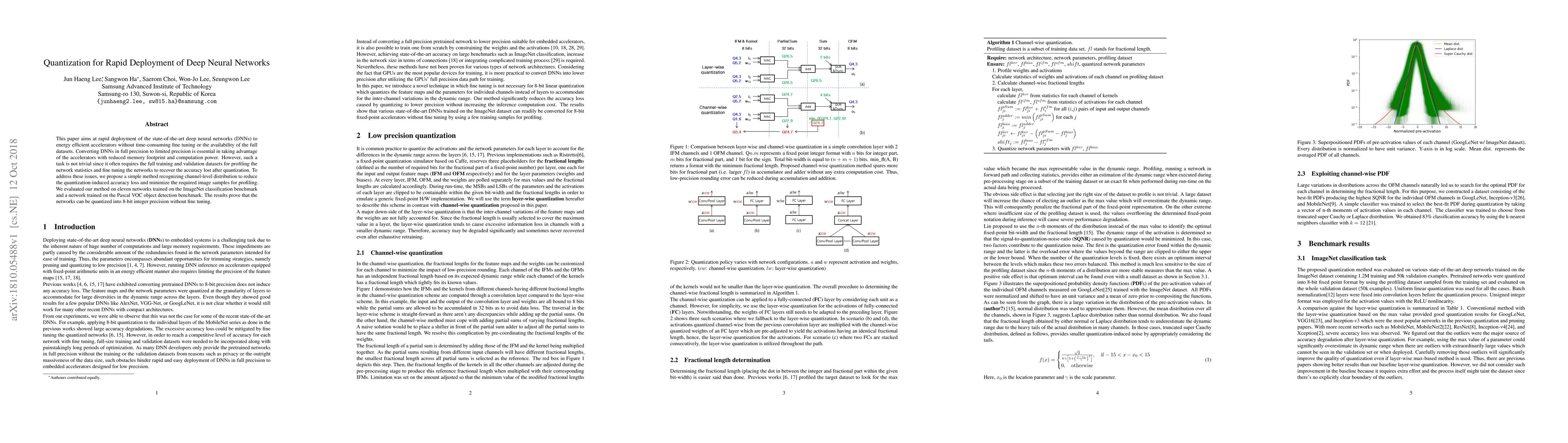 This paper proposes a method to rapidly deploy deep neural networks on energy-efficient accelerators by quantizing them into 8-bit precision without requiring fine tuning or full datasets. The approach leverages channel-level distribution to minimize accuracy loss during quantization.