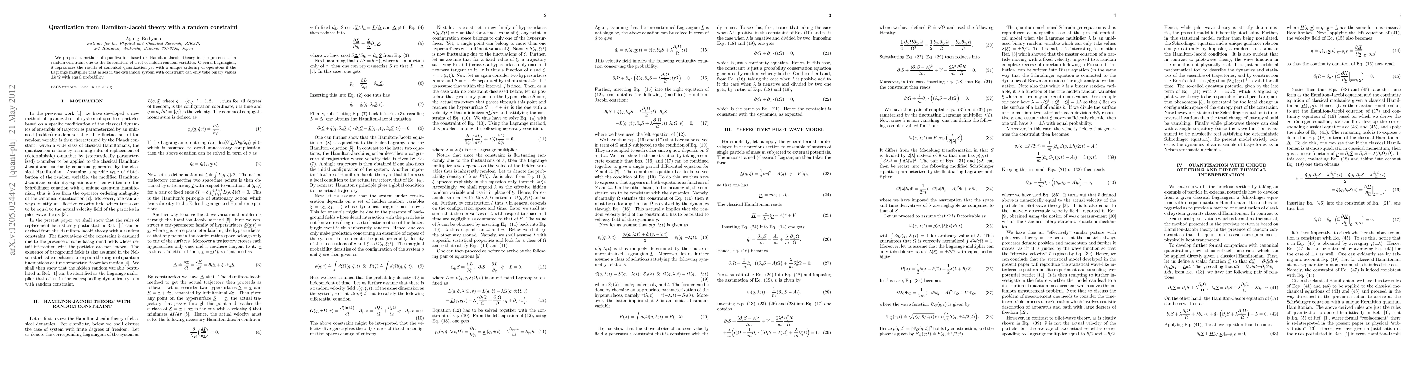 We propose a method of quantization based on Hamilton-Jacobi theory in the presence of a random constraint due to the fluctuations of a set of hidden random variables. Given a Lagrangian, it reproduces the results of canonical quantization yet with a unique ordering of operators if the Lagrange multiplier that arises in the dynamical system with constraint can only take binary values $\pm\hbar/2$ with equal probability.