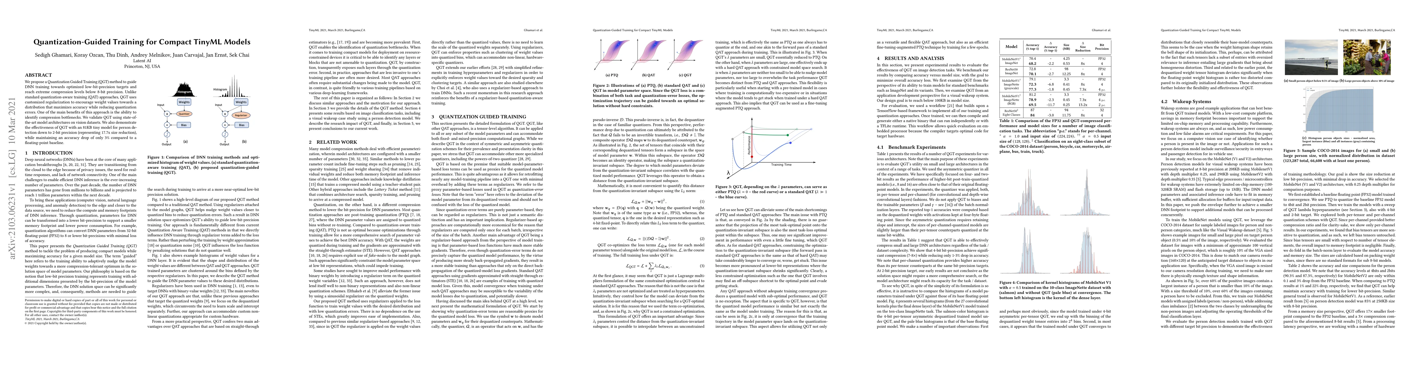 The paper introduces Quantization Guided Training (QGT) to optimize low-bit-precision deep neural networks for TinyML, achieving extreme compression with minimal accuracy loss. The method employs customized regularization to identify and mitigate compression bottlenecks, demonstrating an 81KB tiny model for person detection with a 17.7x size reduction and a 3% accuracy drop.