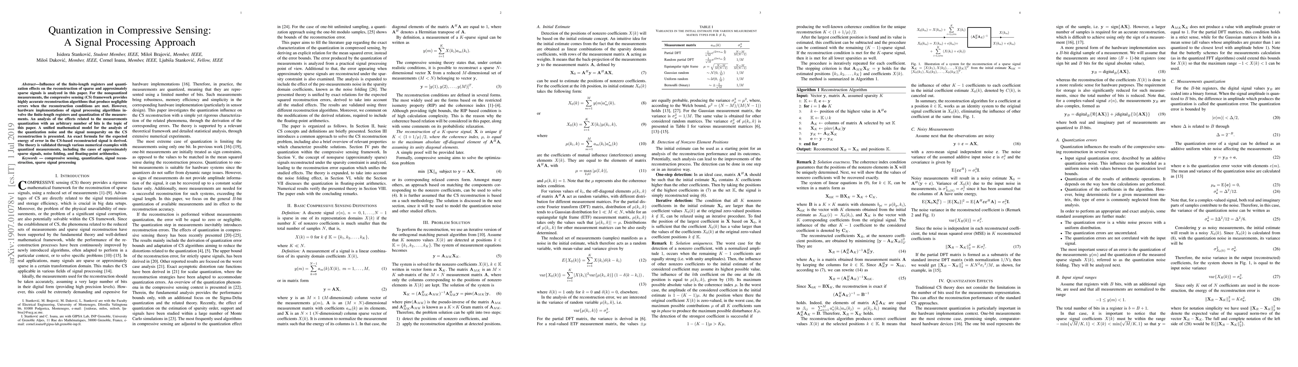 Influence of the finite-length registers and quantization effects on the reconstruction of sparse and approximately sparse signals is analyzed in this paper. For the nonquantized measurements, the compressive sensing (CS) framework provides highly accurate reconstruction algorithms that produce negligible errors when the reconstruction conditions are met. However, hardware implementations of signal processing algorithms involve the finite-length registers and quantization of the measurements. An analysis of the effects related to the measurements quantization with an arbitrary number of bits is the topic of this paper. A unified mathematical model for the analysis of the quantization noise and the signal nonsparsity on the CS reconstruction is presented. An exact formula for the expected energy of error in the CS-based reconstructed signal is derived. The theory is validated through various numerical examples with quantized measurements, including the cases of approximately sparse signals, noise folding, and floating-point arithmetics.