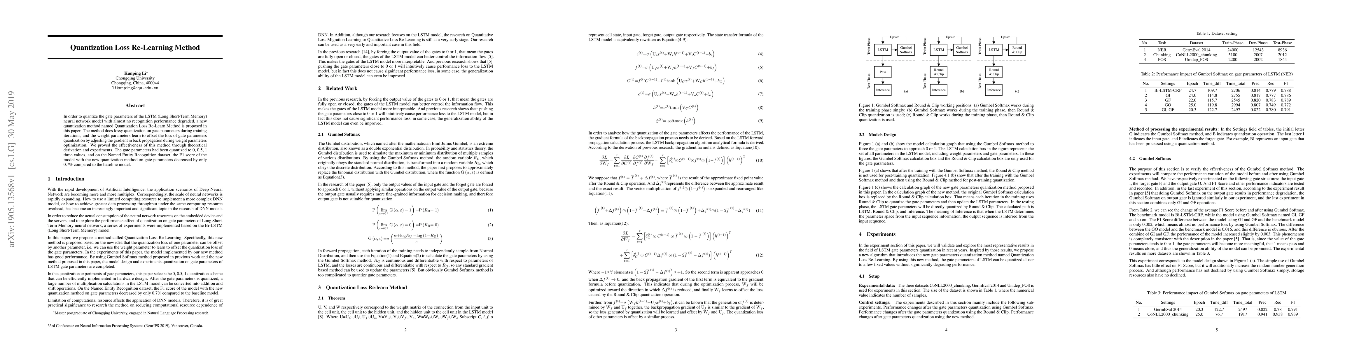 In order to quantize the gate parameters of the LSTM (Long Short-Term Memory) neural network model with almost no recognition performance degraded, a new quantization method named Quantization Loss Re-Learn Method is proposed in this paper. The method does lossy quantization on gate parameters during training iterations, and the weight parameters learn to offset the loss of gate parameters quantization by adjusting the gradient in back propagation during weight parameters optimization. We proved the effectiveness of this method through theoretical derivation and experiments. The gate parameters had been quantized to 0, 0.5, 1 three values, and on the Named Entity Recognition dataset, the F1 score of the model with the new quantization method on gate parameters decreased by only 0.7% compared to the baseline model.