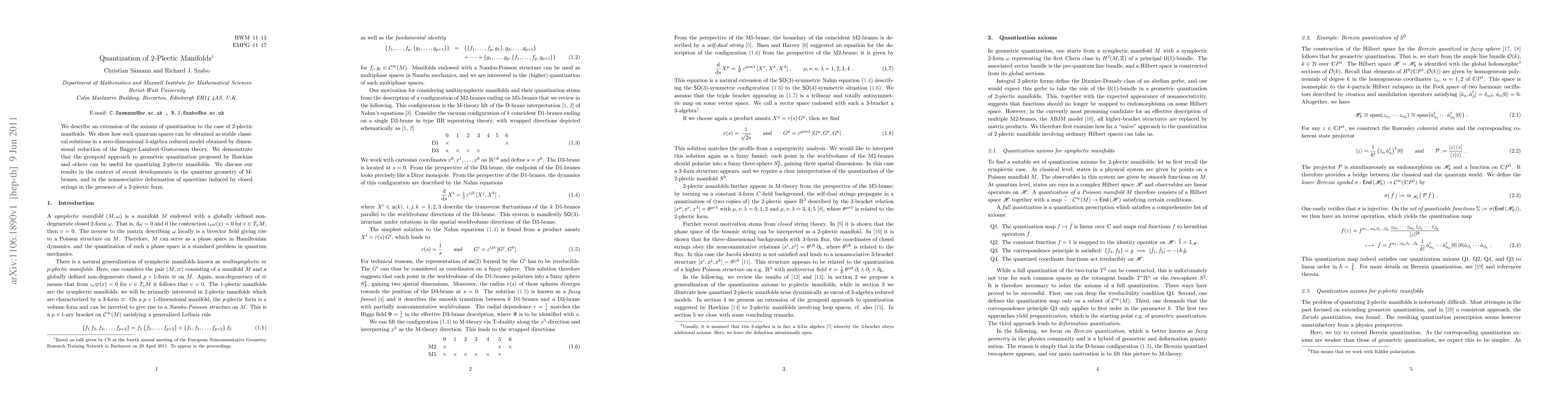 This paper extends quantization axioms to 2-plectic manifolds and demonstrates their realization via stable classical solutions in a reduced 3-algebra model derived from Bagger-Lambert-Gustavsson theory. The groupoid approach to geometric quantization is shown to be effective for this quantization, contextualizing the results within advancements in M-brane quantum geometry and nonassociative spacetime deformation.