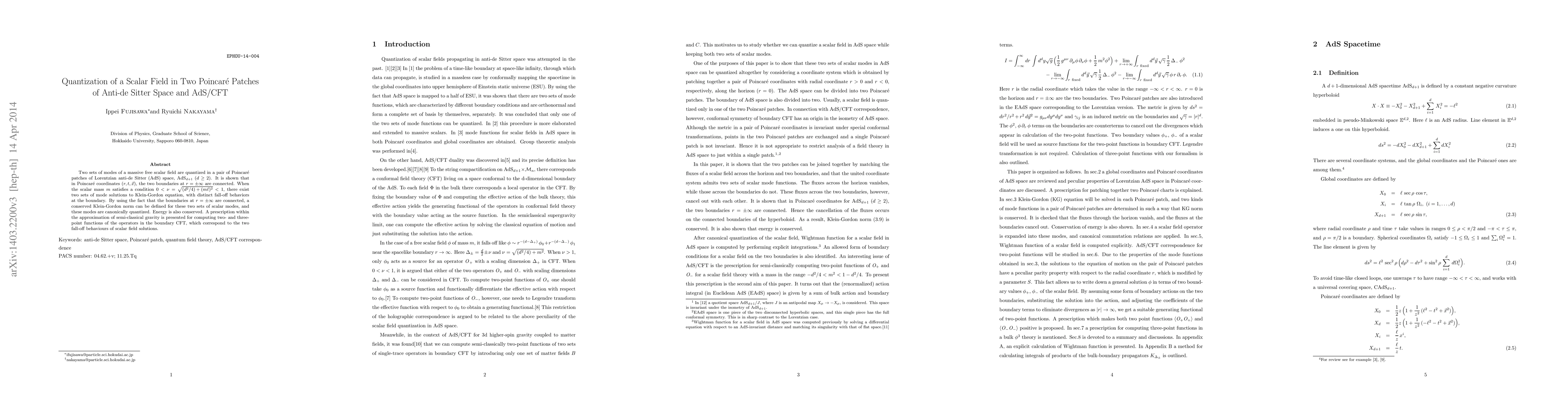 This research demonstrates the quantization of a massive scalar field in two Poincaré patches of Anti-de Sitter (AdS) space, showing a conserved Klein-Gordon norm and energy. It establishes a connection between the boundaries at r=±∞ and presents a semi-classical gravity prescription for computing two- and three-point functions of boundary CFT operators, corresponding to distinct scalar field fall-off behaviors.