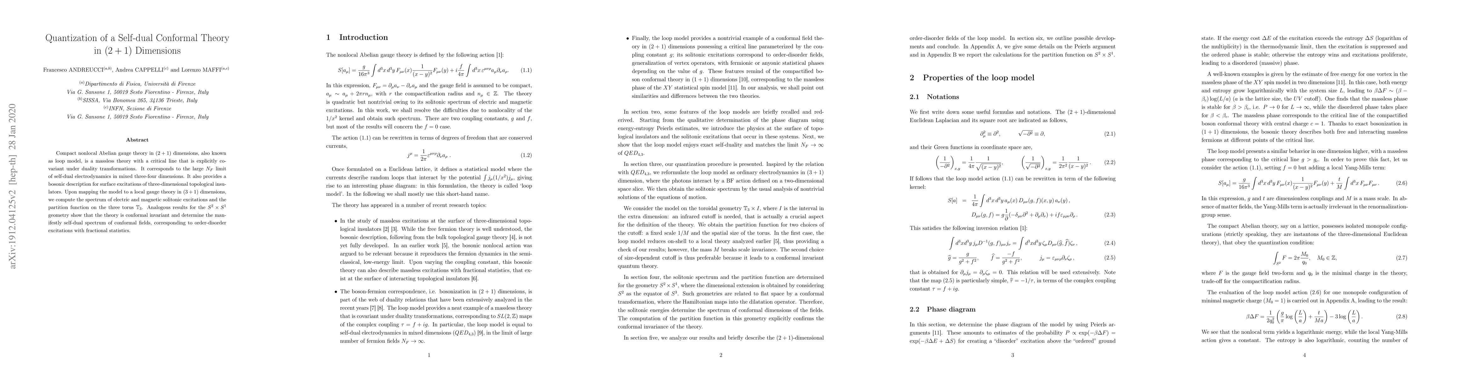 Compact nonlocal Abelian gauge theory in (2+1) dimensions, also known as loop model, is a massless theory with a critical line that is explicitly covariant under duality transformations. It corresponds to the large N_F limit of self-dual electrodynamics in mixed three-four dimensions. It also provides a bosonic description for surface excitations of three-dimensional topological insulators. Upon mapping the model to a local gauge theory in (3+1) dimensions, we compute the spectrum of electric and magnetic solitonic excitations and the partition function on the three torus T_3. Analogous results for the S^2 x S^1 geometry show that the theory is conformal invariant and determine the manifestly self-dual spectrum of conformal fields, corresponding to order-disorder excitations with fractional statistics.