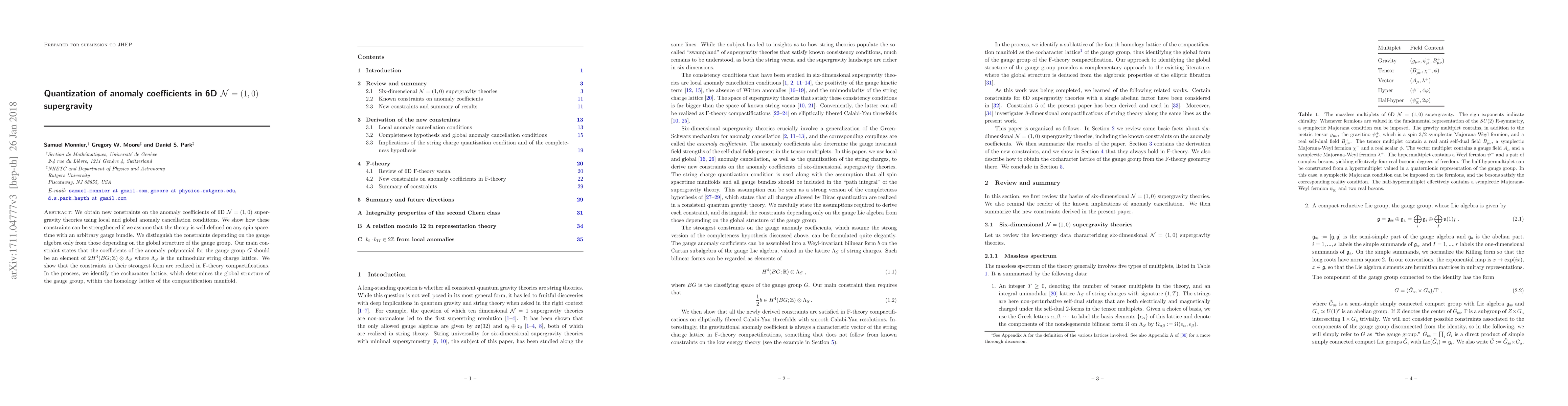 This paper quantizes anomaly coefficients in 6D $\mathcal{N}=(1,0)$ supergravity, establishing constraints based on local and global anomaly cancellation. It identifies that the coefficients must belong to a specific lattice structure, realized in F-theory compactifications, and distinguishes constraints dependent on gauge algebra versus global gauge group structure.