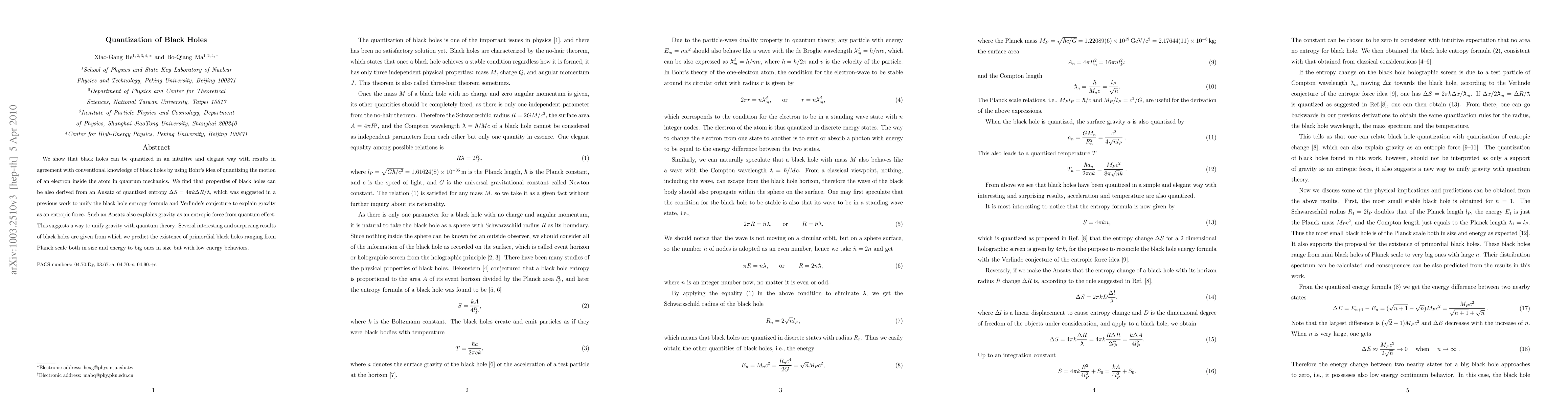 We show that black holes can be quantized in an intuitive and elegant way with results in agreement with conventional knowledge of black holes by using Bohr's idea of quantizing the motion of an electron inside the atom in quantum mechanics. We find that properties of black holes can be also derived from an Ansatz of quantized entropy $\Delta S=4\pi k {\Delta R / \lambdabar}$, which was suggested in a previous work to unify the black hole entropy formula and Verlinde's conjecture to explain gravity as an entropic force. Such an Ansatz also explains gravity as an entropic force from quantum effect. This suggests a way to unify gravity with quantum theory. Several interesting and surprising results of black holes are given from which we predict the existence of primordial black holes ranging from Planck scale both in size and energy to big ones in size but with low energy behaviors.