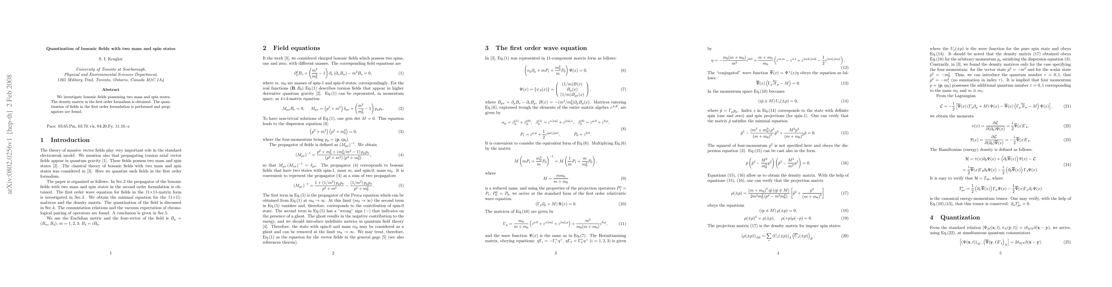 We investigate bosonic fields possessing two mass and spin states. The density matrix in the first order formalism is obtained. The quantization of fields in the first order formulation is performed and propagators are found.