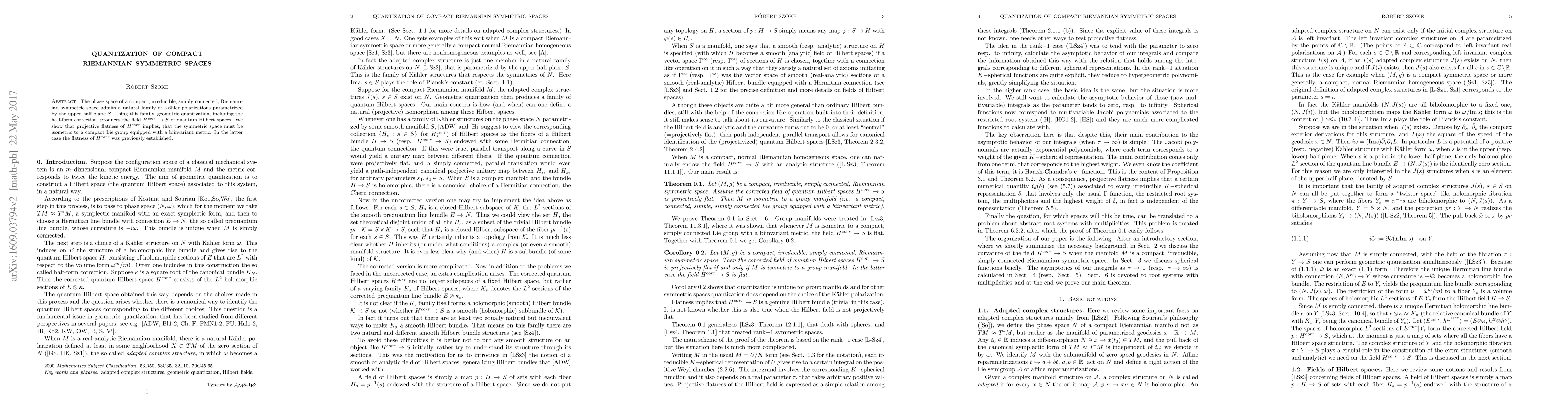 The phase space of a compact, irreducible, simply connected, Riemannian symmetric space admits a natural family of K\"ahler polarizations parametrized by the upper half plane $S$. Using this family, geometric quantization, including the half-form correction, produces the field $H^{corr}\rightarrow S$ of quantum Hilbert spaces. We show that projective flatness of $H^{corr}$ implies, that the symmetric space must be isometric to a compact Lie group equipped with a biinvariant metric. In the latter case the flatness of $H^{corr}$ was previously established.