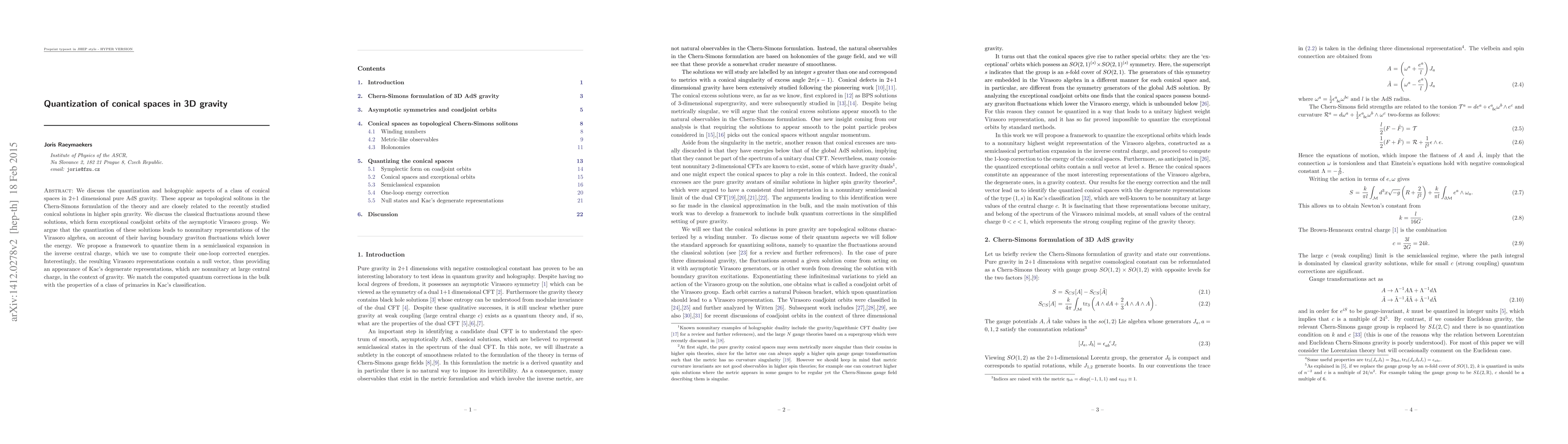We discuss the quantization and holographic aspects of a class of conical spaces in 2+1 dimensional pure AdS gravity. These appear as topological solitons in the Chern-Simons formulation of the theory and are closely related to the recently studied conical solutions in higher spin gravity. We discuss the classical fluctuations around these solutions, which form exceptional coadjoint orbits of the asymptotic Virasoro group. We argue that the quantization of these solutions leads to nonunitary representations of the Virasoro algebra, on account of their having boundary graviton fluctuations which lower the energy. We propose a framework to quantize them in a semiclassical expansion in the inverse central charge, which we use to compute their one-loop corrected energies. Interestingly, the resulting Virasoro representations contain a null vector, thus providing an appearance of Kac's degenerate representations, which are nonunitary at large central charge, in the context of gravity. We match the computed quantum corrections in the bulk with the properties of a class of primaries in Kac's classification.