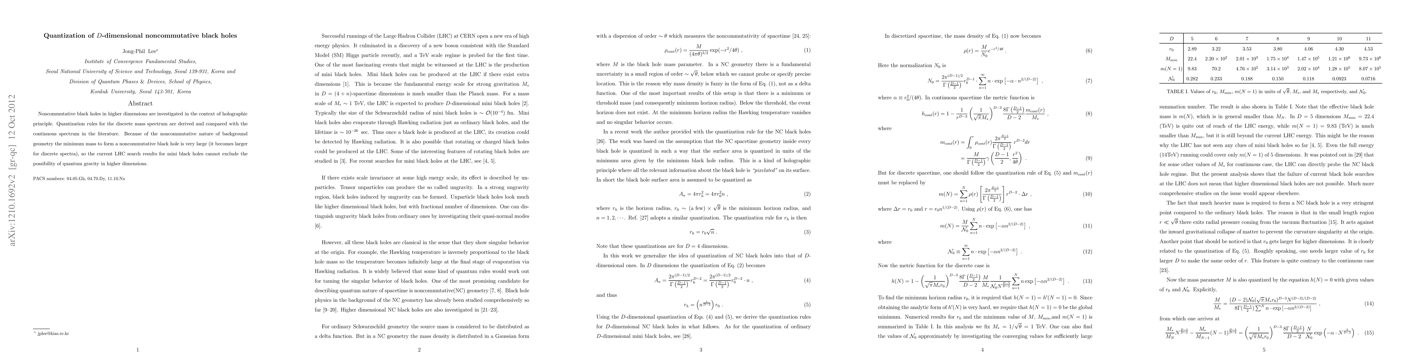 This paper explores noncommutative black holes in higher dimensions within the framework of the holographic principle, deriving quantization rules for their mass spectrum and comparing it to continuous spectra. The noncommutative geometry implies a significantly larger minimum mass for black hole formation, suggesting that current LHC results do not rule out quantum gravity in higher dimensions.