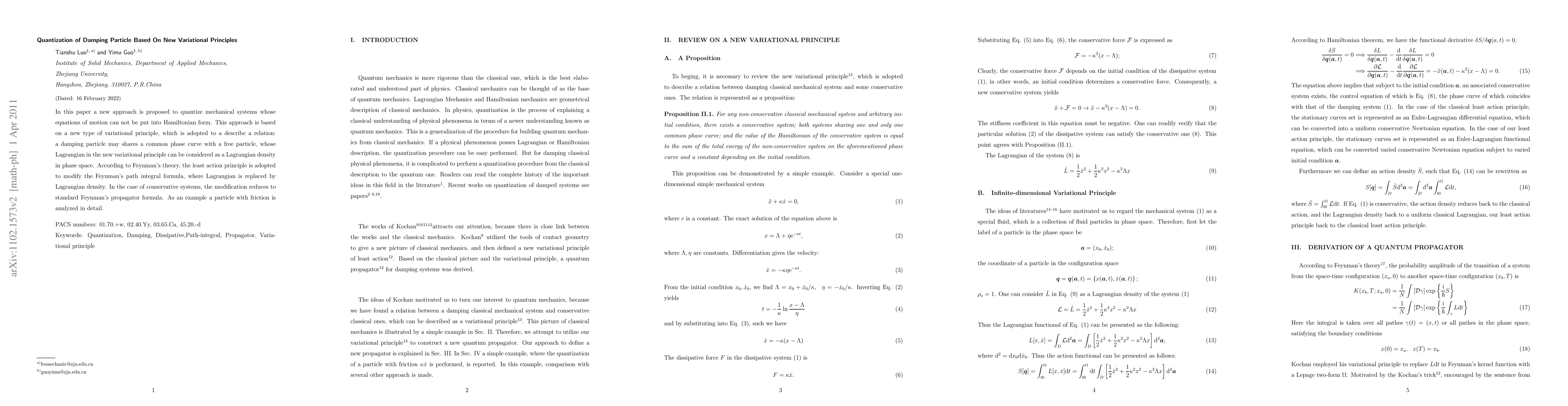 In this paper a new approach is proposed to quantize mechanical systems whose equations of motion can not be put into Hamiltonian form. This approach is based on a new type of variational principle, which is adopted to a describe a relation: a damping particle may shares a common phase curve with a free particle, whose Lagrangian in the new variational principle can be considered as a Lagrangian density in phase space. According to Feynman's theory, the least action principle is adopted to modify the Feynman's path integral formula, where Lagrangian is replaced by Lagrangian density. In the case of conservative systems, the modification reduces to standard Feynman's propagator formula. As an example a particle with friction is analyzed in detail.