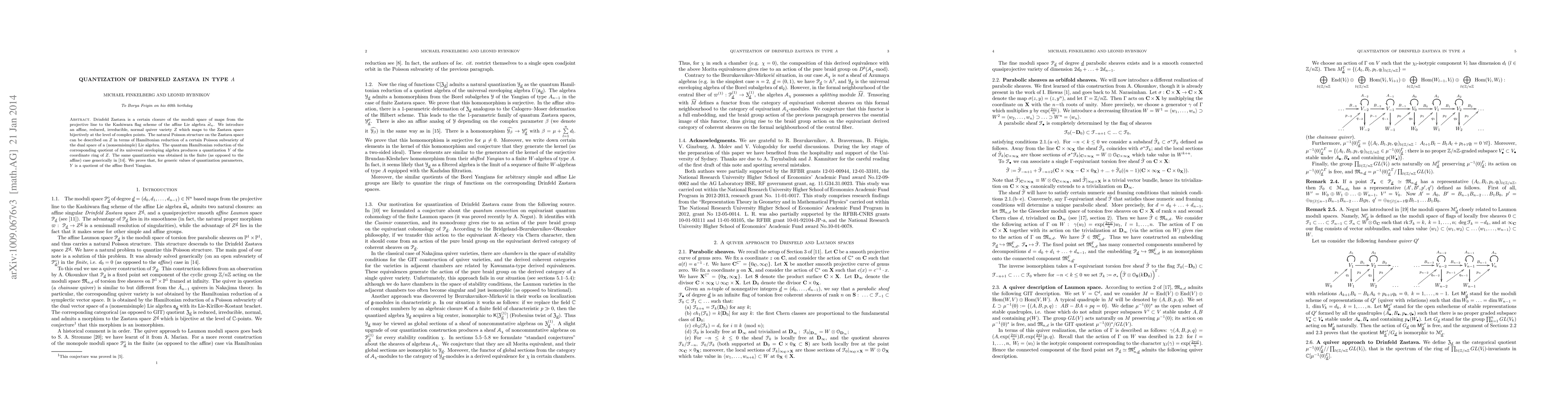 Drinfeld Zastava is a certain closure of the moduli space of maps from the projective line to the Kashiwara flag scheme of the affine Lie algebra $\hat{sl}_n$. We introduce an affine, reduced, irreducible, normal quiver variety $Z$ which maps to the Zastava space bijectively at the level of complex points. The natural Poisson structure on the Zastava space can be described on $Z$ in terms of Hamiltonian reduction of a certain Poisson subvariety of the dual space of a (nonsemisimple) Lie algebra. The quantum Hamiltonian reduction of the corresponding quotient of its universal enveloping algebra produces a quantization $Y$ of the coordinate ring of $Z$. The same quantization was obtained in the finite (as opposed to the affine) case generically in arXiv:math/0409031. We prove that, for generic values of quantization parameters, $Y$ is a quotient of the affine Borel Yangian.