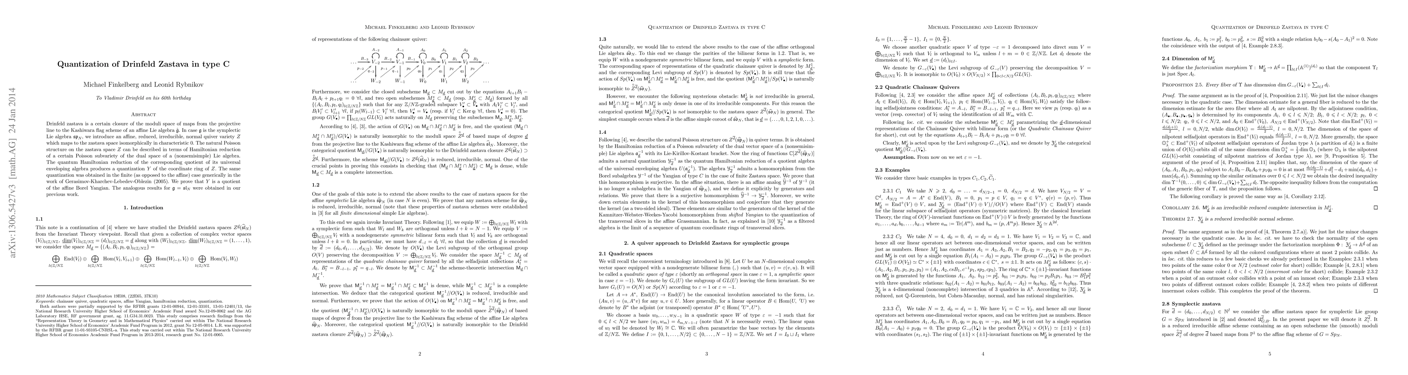 The paper introduces an affine, reduced, irreducible, normal quiver variety Z which maps to the Drinfeld zastava space isomorphically in characteristic 0, utilizing Hamiltonian reduction of a Poisson subvariety of the dual space of a nonsemisimple Lie algebra.