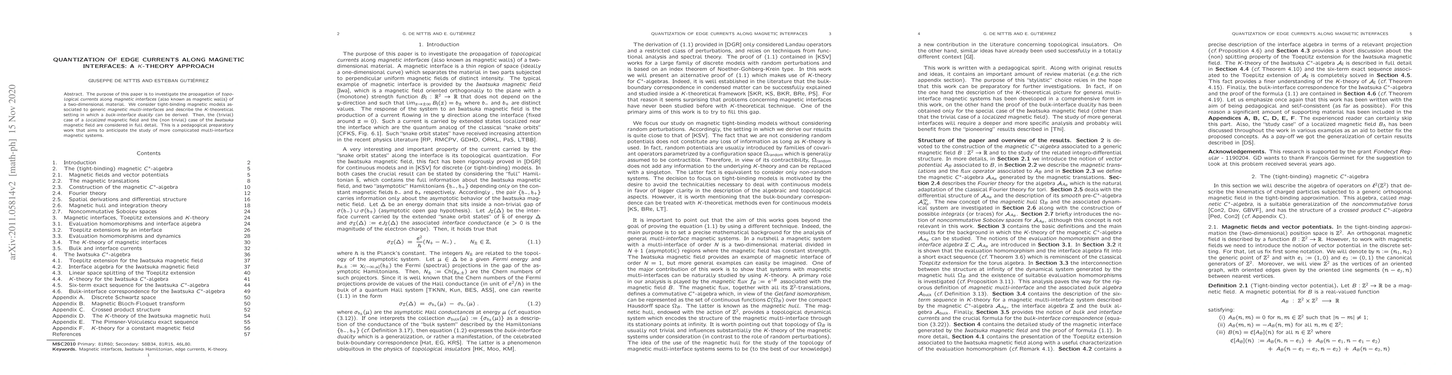 The purpose of this paper is to investigate the propagation of topological currents along magnetic interfaces (also known as magnetic walls) of a two-dimensional material. We consider tight-binding magnetic models associated to generic magnetic multi-interfaces and describe the K-theoretical setting in which a bulk-interface duality can be derived. Then, the (trivial) case of a localized magnetic field and the (non trivial) case of the Iwatsuka magnetic field are considered in full detail. This is a pedagogical preparatory work that aims to anticipate the study of more complicated multi-interface magnetic systems.