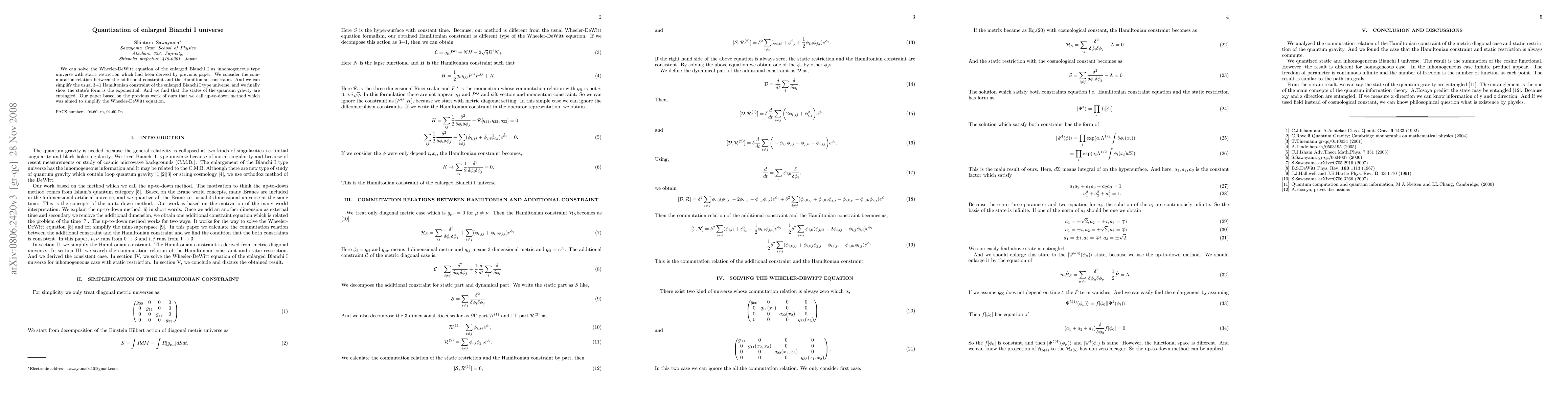 We can solve the Wheeler-DeWitt equation of the enlarged Bianchi I as inhomogeneous type universe with static restriction which had been derived by previous paper. We consider the commutation relation between the static restriction and the Hamiltonian constraint. And we can simplify the usual 3+1 Hamiltonian constraint of the enlarged Biancki I type universe, and we finally show the state's form is the exponential. And we find that the states of the quantum gravity are entangled. Our paper based on the previous work of ours that we call up-to-down method which was aimed to simplify the Wheeler-DeWitt equation.