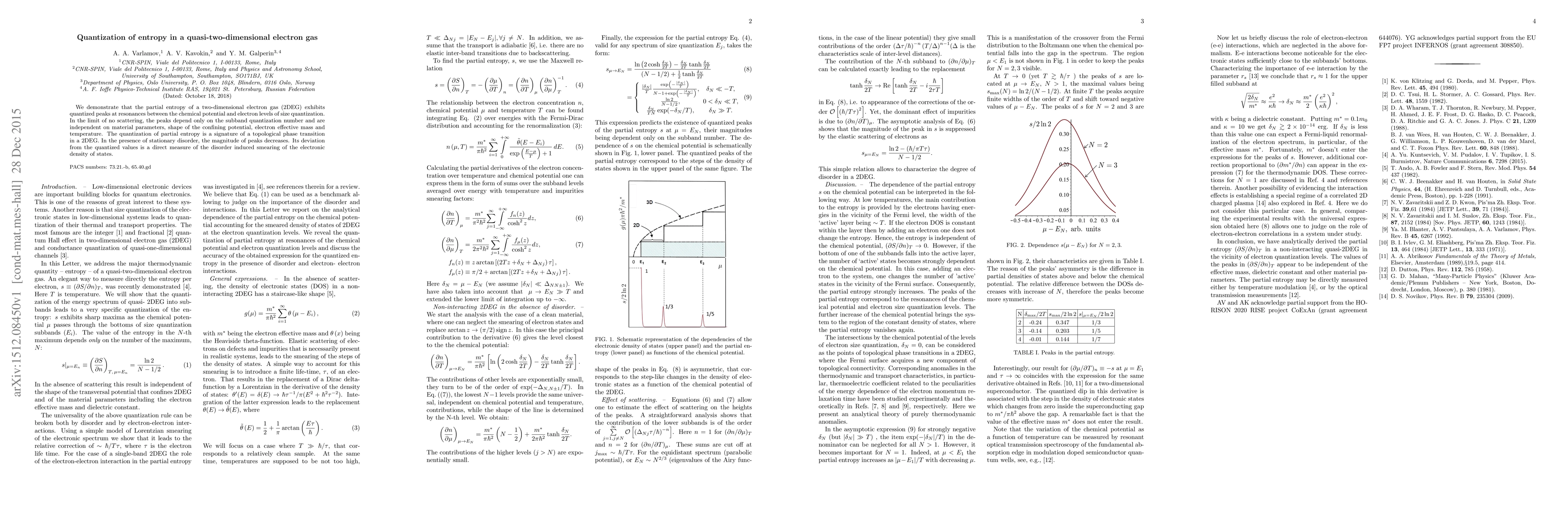 This paper shows that the partial entropy in a quasi-two-dimensional electron gas exhibits quantized peaks at specific energy resonances, indicating a topological phase transition. In the absence of scattering, these peaks are independent of material specifics and temperature, but disorder reduces their magnitude, directly correlating with the smearing of the electronic density of states.