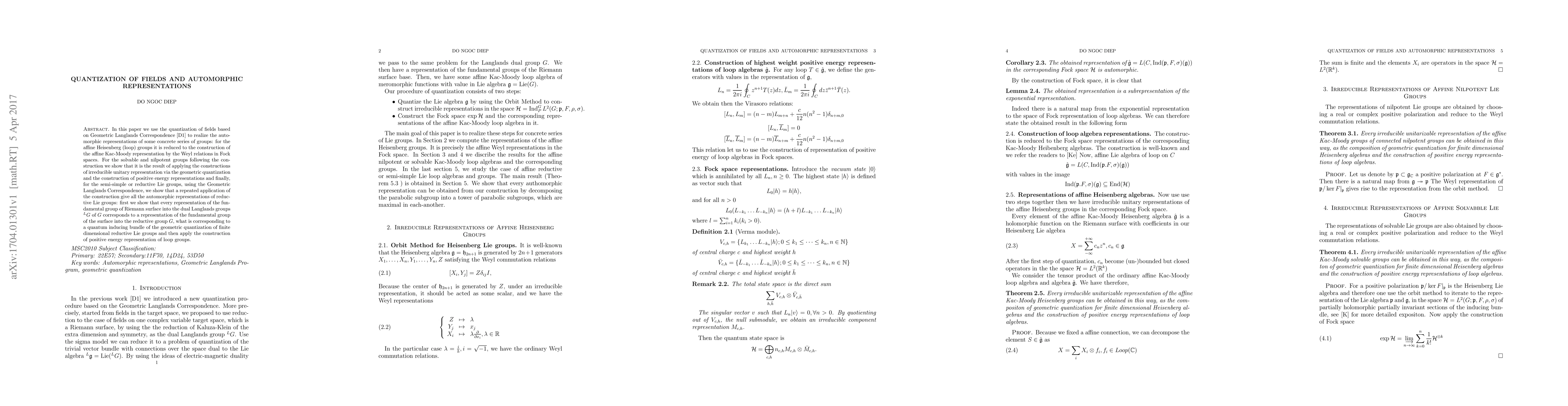 This paper quantizes fields using the Geometric Langlands Correspondence to construct automorphic representations for various groups, including affine Heisenberg groups, solvable and nilpotent groups, and semi-simple or reductive Lie groups, demonstrating the application of geometric quantization and positive energy representations.