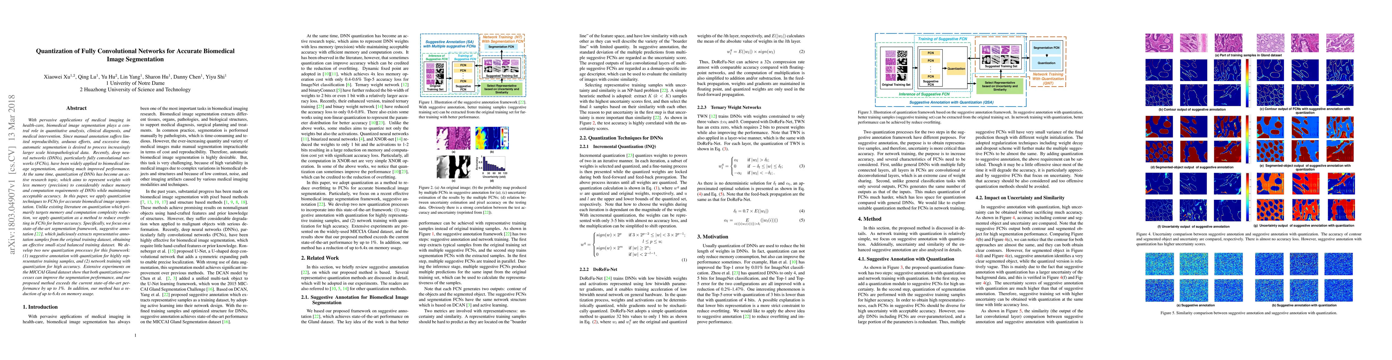 With pervasive applications of medical imaging in health-care, biomedical image segmentation plays a central role in quantitative analysis, clinical diagno- sis, and medical intervention. Since manual anno- tation su ers limited reproducibility, arduous e orts, and excessive time, automatic segmentation is desired to process increasingly larger scale histopathological data. Recently, deep neural networks (DNNs), par- ticularly fully convolutional networks (FCNs), have been widely applied to biomedical image segmenta- tion, attaining much improved performance. At the same time, quantization of DNNs has become an ac- tive research topic, which aims to represent weights with less memory (precision) to considerably reduce memory and computation requirements of DNNs while maintaining acceptable accuracy. In this paper, we apply quantization techniques to FCNs for accurate biomedical image segmentation. Unlike existing litera- ture on quantization which primarily targets memory and computation complexity reduction, we apply quan- tization as a method to reduce over tting in FCNs for better accuracy. Speci cally, we focus on a state-of- the-art segmentation framework, suggestive annotation [22], which judiciously extracts representative annota- tion samples from the original training dataset, obtain- ing an e ective small-sized balanced training dataset. We develop two new quantization processes for this framework: (1) suggestive annotation with quantiza- tion for highly representative training samples, and (2) network training with quantization for high accuracy. Extensive experiments on the MICCAI Gland dataset show that both quantization processes can improve the segmentation performance, and our proposed method exceeds the current state-of-the-art performance by up to 1%. In addition, our method has a reduction of up to 6.4x on memory usage.