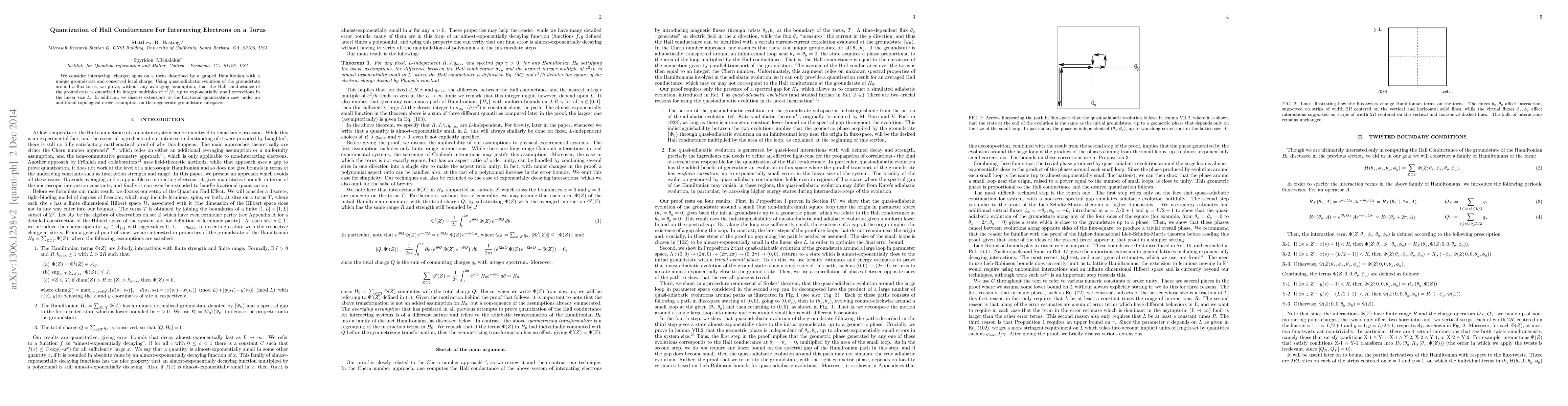 We consider interacting, charged spins on a torus described by a gapped Hamiltonian with a unique groundstate and conserved local charge. Using quasi-adiabatic evolution of the groundstate around a flux-torus, we prove, without any averaging assumption, that the Hall conductance of the groundstate is quantized in integer multiples of e^2/h, up to exponentially small corrections in the linear size of the system. In addition, we discuss extensions to the fractional quantization case under an additional topological order assumption on the degenerate groundstate subspace.