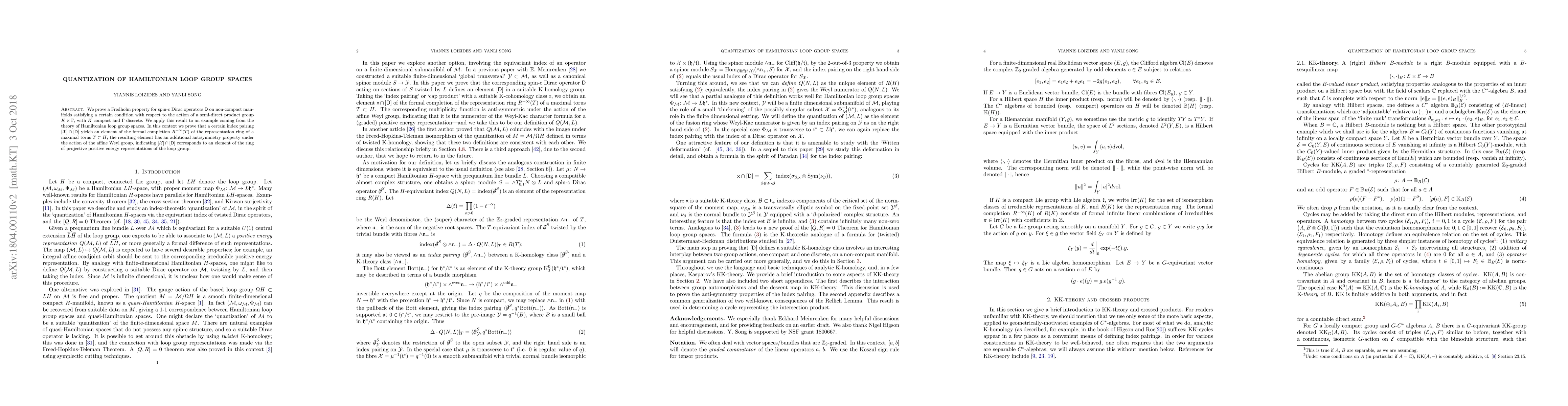 This paper proves a Fredholm property for spin-c Dirac operators on non-compact manifolds under a specific group action, and applies it to Hamiltonian loop group spaces, showing that the index pairing yields an antisymmetric element in the ring of projective positive energy representations of the loop group.