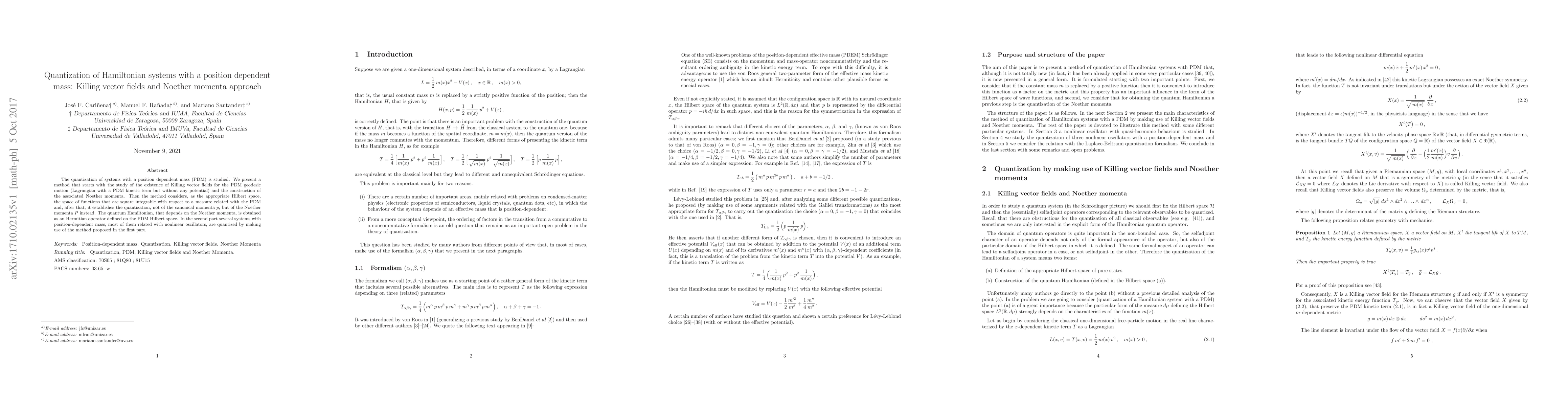 This paper proposes a novel method for quantizing Hamiltonian systems with position-dependent mass by utilizing Killing vector fields and Noether momenta. The method quantizes the Noether momenta instead of the canonical momenta, leading to a quantum Hamiltonian defined on a PDM Hilbert space, and is applied to various nonlinear oscillator systems.