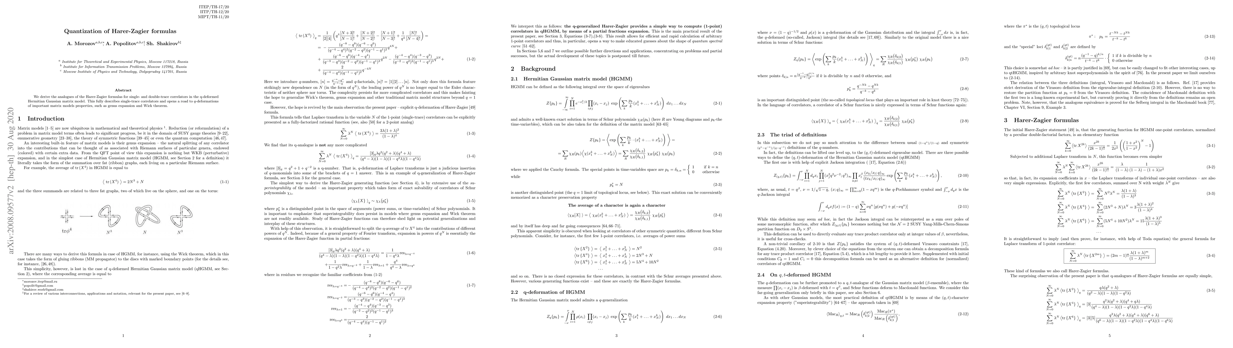 This paper quantizes the Harer-Zagier formulas for single- and double-trace correlators in a q-deformed Hermitian Gaussian matrix model, providing a foundation for $q$-deformations of matrix model properties like genus expansion and the Wick theorem.