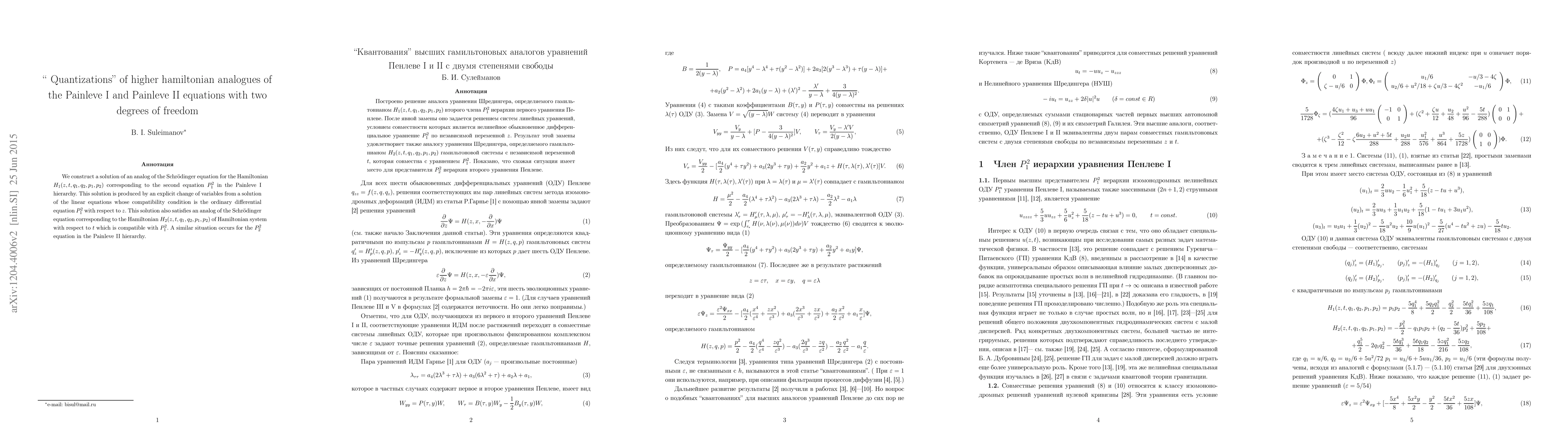 We construct a solution of an analog of the Schr\"{o}dinger equation for the Hamiltonian $ H_I (z, t, q_1, q_2, p_1, p_2) $ corresponding to the second equation $P_1^2$ in the Painleve I hierarchy. This solution is produced by an explicit change of variables from a solution of the linear equations whose compatibility condition is the ordinary differential equation $P_1^2$ with respect to $z$. This solution also satisfies an analog of the Schr\"{o}dinger equation corresponding to the Hamiltonian $ H_{II} (z, t, q_1, q_2, p_1, p_2) $ of Hamiltonian system with respect to $t$ which is compatible with $P_1^2$. A similar situation occurs for the $P_2^2$ equation in the Painleve II hierarchy.