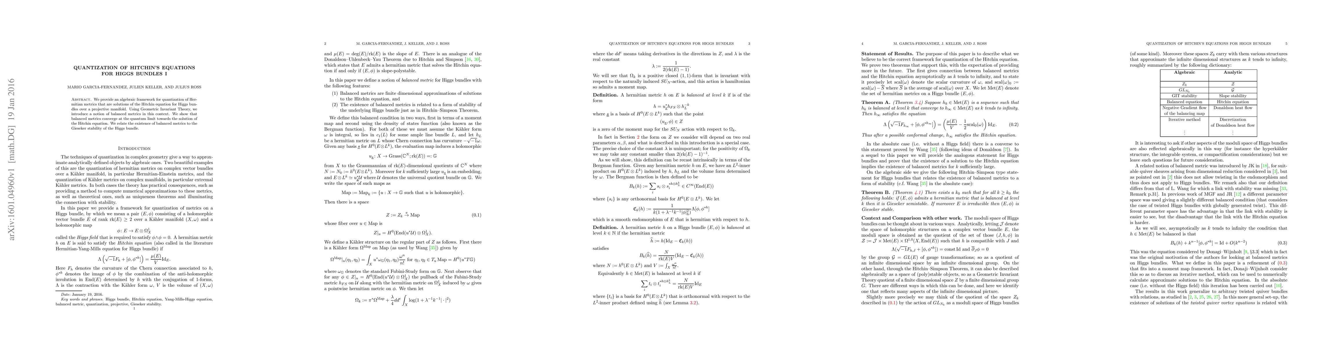We provide an algebraic framework for quantization of Hermitian metrics that are solutions of the Hitchin equation for Higgs bundles over a projective manifold. Using Geometric Invariant Theory, we introduce a notion of balanced metrics in this context. We show that balanced metrics converge at the quantum limit towards the solution of the Hitchin equation. We relate the existence of balanced metrics to the Gieseker stability of the Higgs bundle.