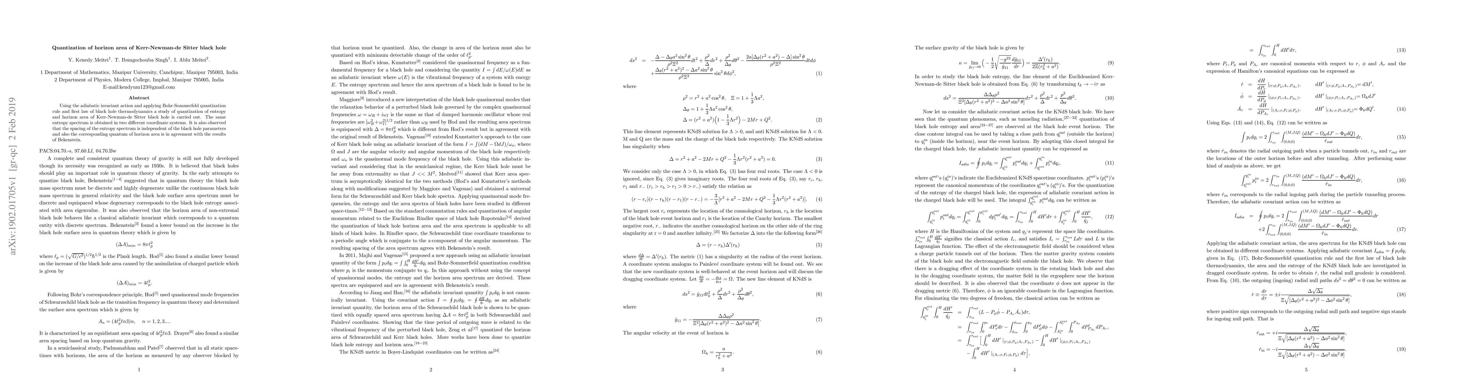 This paper quantizes the entropy and horizon area of Kerr-Newman-de Sitter black holes using adiabatic invariant action and Bohr-Sommerfeld quantization, with results consistent across different coordinate systems and in agreement with Bekenstein's findings on horizon area quantization.