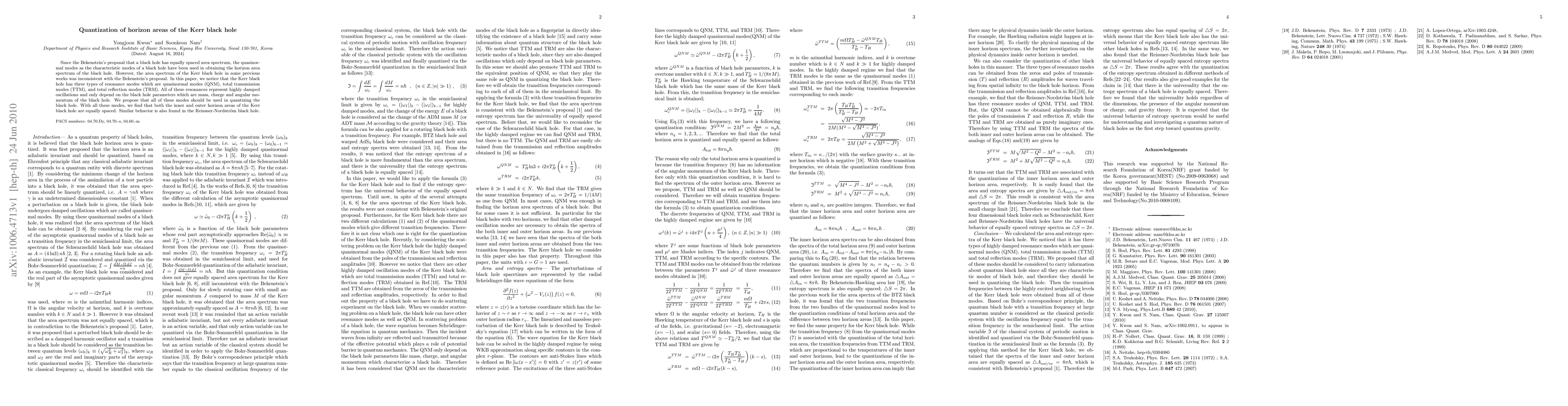 This paper quantizes the horizon areas of the Kerr black hole by considering quasinormal, total transmission, and total reflection modes, finding that all three types of resonances lead to equally spaced area spectra, consistent with Bekenstein's proposal. The study also extends this finding to the Reissner-Nordstrom black hole.