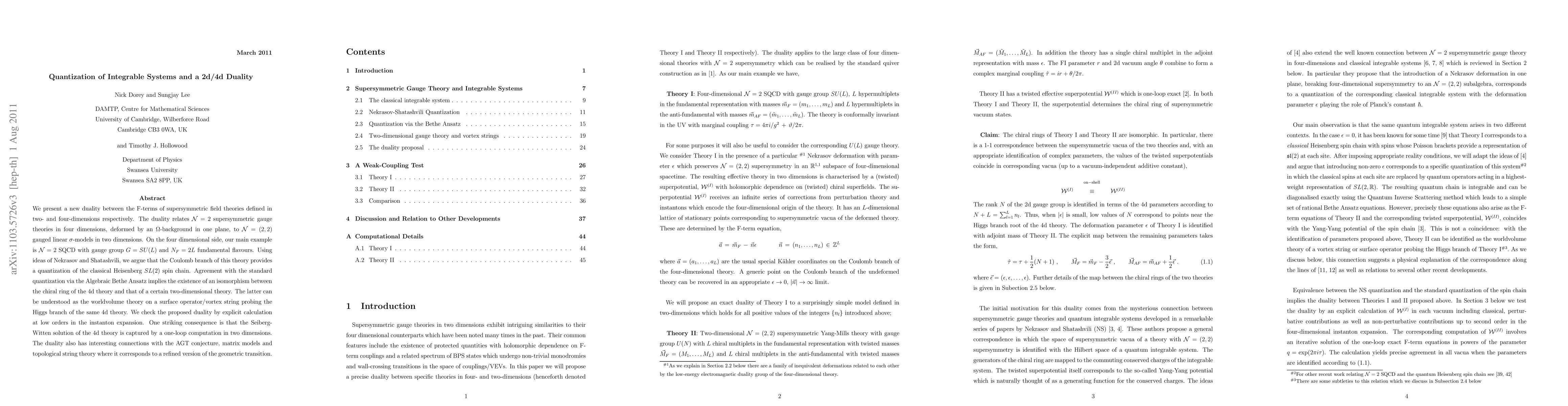 This paper establishes a new duality between N=2 supersymmetric gauge theories in four dimensions and N=(2,2) gauged linear sigma-models in two dimensions, showing that the Coulomb branch of the 4d theory quantizes the classical Heisenberg SL(2) spin chain. The duality is verified through explicit calculations and has implications for the AGT conjecture and topological string theory.