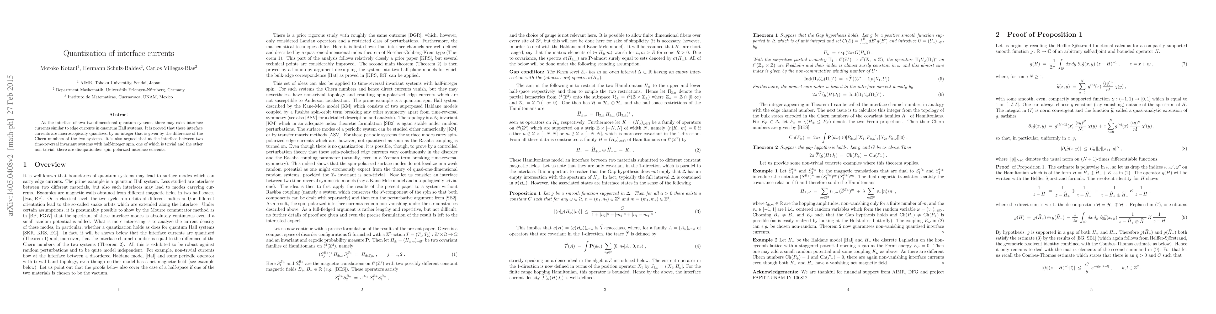 This paper proves that interface currents at the boundary between two two-dimensional quantum systems are macroscopically quantized, with the quantization integer determined by the difference in Chern numbers of the systems. It also discusses dissipationless spin-polarized interface currents in the interface between two time-reversal invariant systems with half-integer spin.
