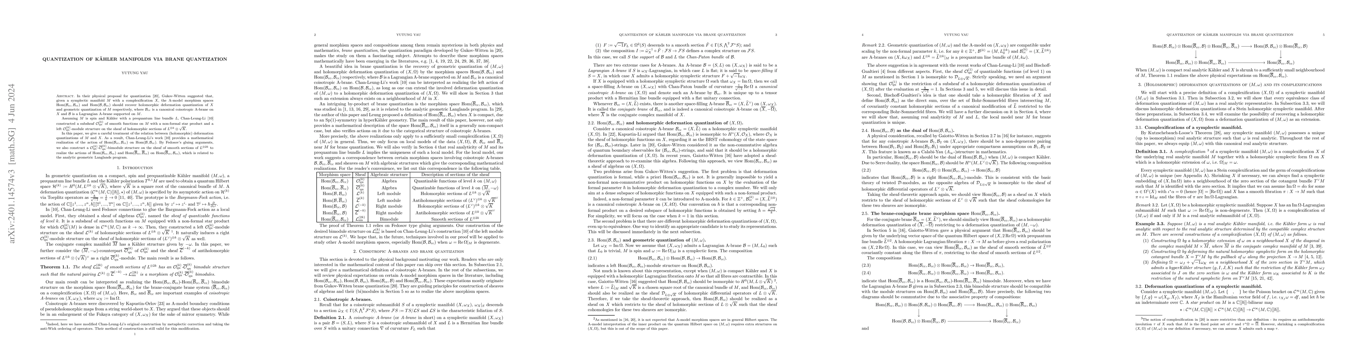 This paper explores the quantization of Kähler manifolds through brane quantization, showing that Chan-Leung-Li's construction realizes the action of A-model morphism spaces. It also constructs bimodule structures related to the analytic geometric Langlands program.