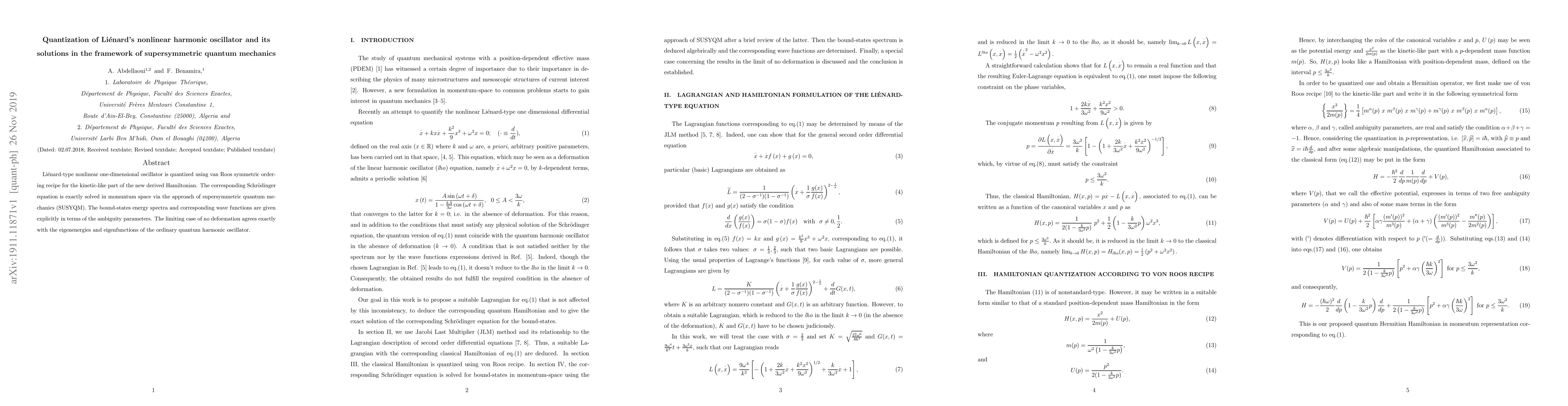 This paper quantizes Li\'enard's nonlinear oscillator using van Roos symmetric ordering and solves it via supersymmetric quantum mechanics, yielding explicit expressions for energy spectra and wave functions in terms of ambiguity parameters. The results recover those of the standard quantum harmonic oscillator in the undeformed limit.
