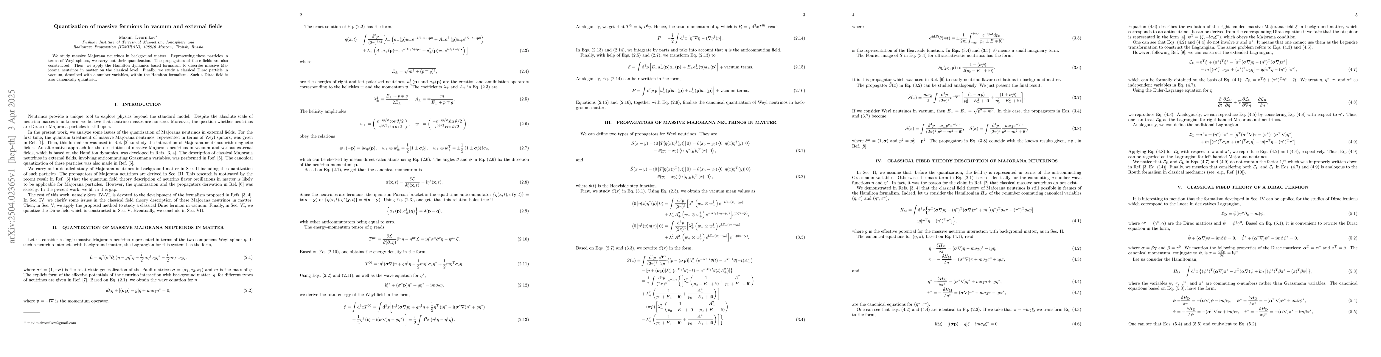 The paper presents a detailed canonical quantization of massive Weyl neutrinos in background matter, derivation of their propagators, and a classical field theory description using Hamilton formalism for Majorana neutrinos and Dirac fermions.