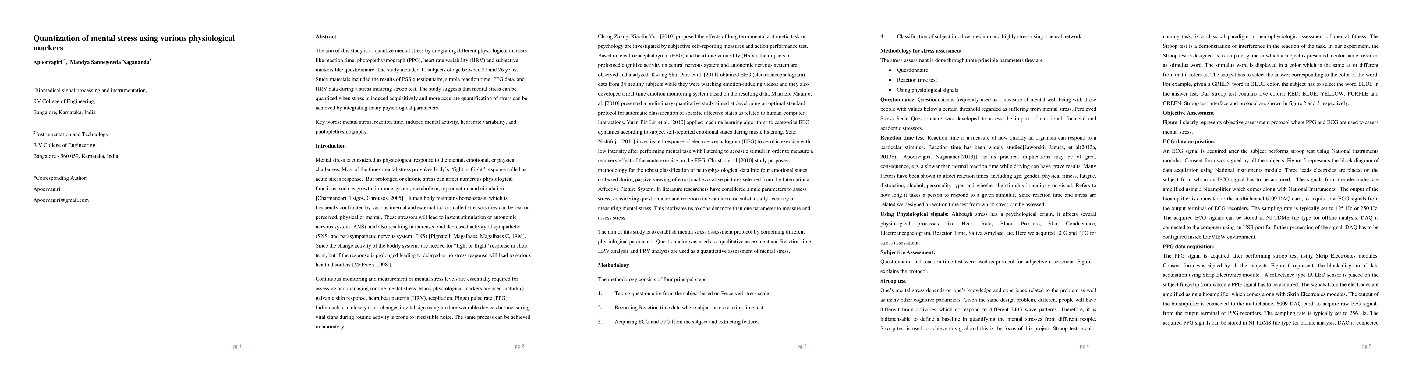 The aim of this study is to quantize mental stress by integrating different physiological markers like reaction time, photoplethysmograph (PPG), heart rate variability (HRV) and subjective markers like questionnaire. The study included 10 subjects of age between 22 and 26 years. Study materials included the results of PSS questionnaire, simple reaction time, PPG data, and HRV data during a stress inducing stroop test. The study suggests that mental stress can be quantized when stress is induced acquisitively and more accurate quantification of stress can be achieved by integrating many physiological parameters.