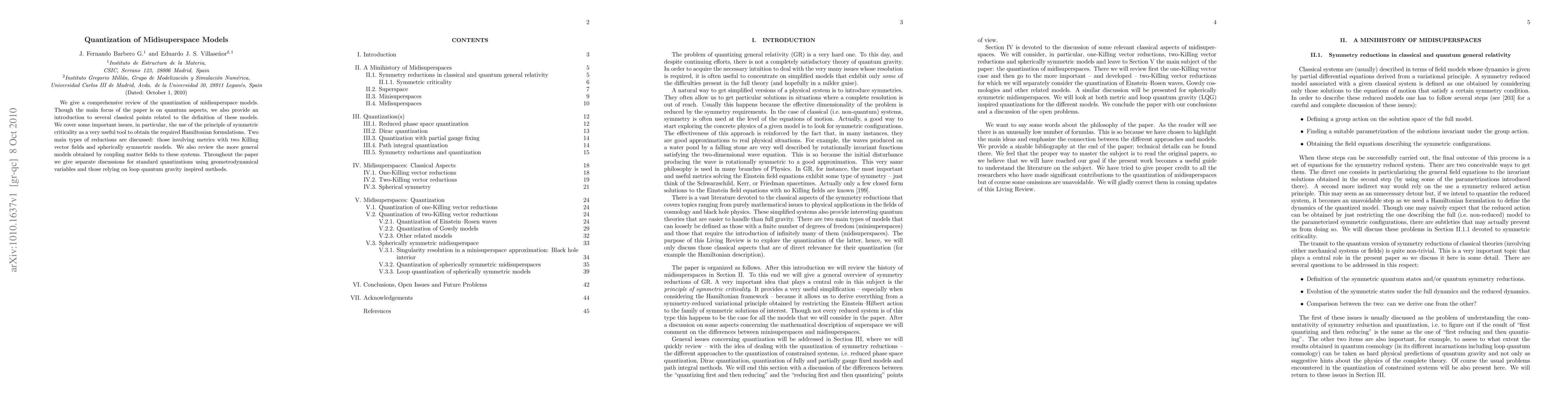 This paper reviews the quantization of midisuperspace models, discussing key findings on two main types of reductions and their Hamiltonian formulations, as well as implications for standard and loop quantum gravity inspired methods.