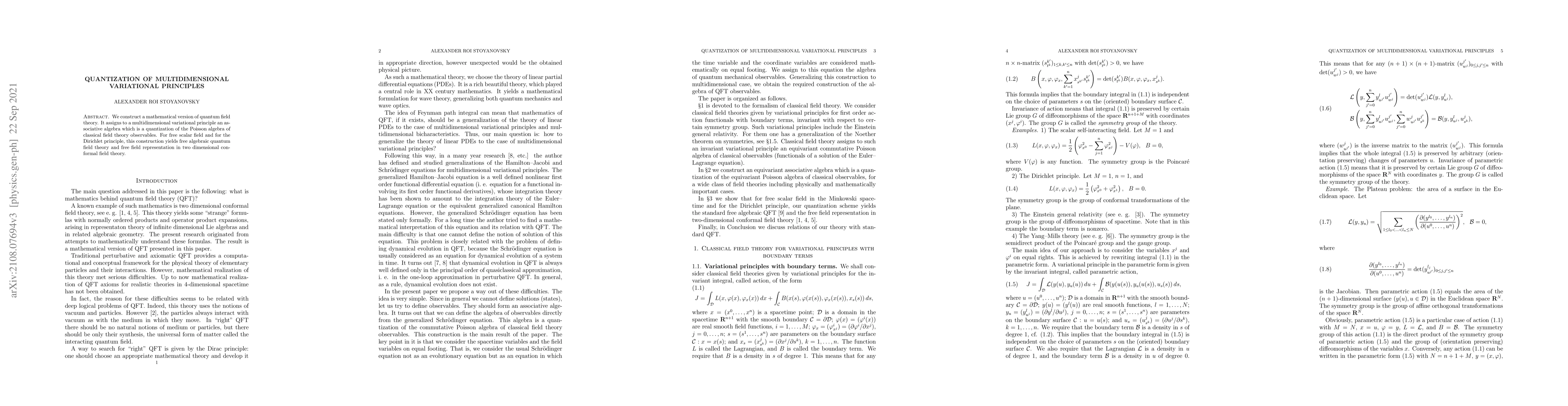 We construct a mathematical version of quantum field theory. It assigns to a multidimensional variational principle an associative algebra which is a quantization of the Poisson algebra of classical field theory observables. For free scalar field and for the Dirichlet principle, this construction yields free algebraic quantum field theory and free field representation in two dimensional conformal field theory.