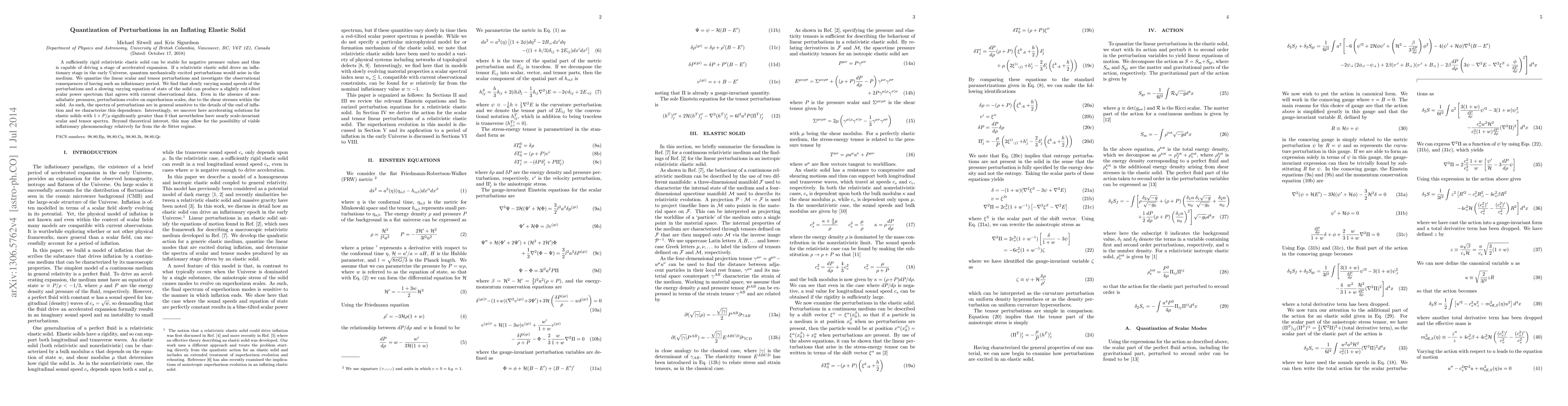 A sufficiently rigid relativistic elastic solid can be stable for negative pressure values and thus is capable of driving a stage of accelerated expansion. If a relativistic elastic solid drove an inflationary stage in the early Universe, quantum mechanically excited perturbations would arise in the medium. We quantize the linear scalar and tensor perturbations and investigate the observational consequences of having such an inflationary period. We find that slowly varying sound speeds of the perturbations and a slowing varying equation of state of the solid can produce a slightly red-tilted scalar power spectrum that agrees with current observational data. Even in the absence of nonadiabatic pressures, perturbations evolve on superhorizon scales, due to the shear stresses within the solid. As such, the spectra of perturbations are in general sensitive to the details of the end of inflation and we characterize this dependence. Interestingly, we uncover here accelerating solutions for elastic solids with (1 + P/\rho) significantly greater than 0 that nevertheless have nearly scale-invariant scalar and tensor spectra. Beyond theoretical interest, this may allow for the possibility of viable inflationary phenomenology relatively far from the de Sitter regime.