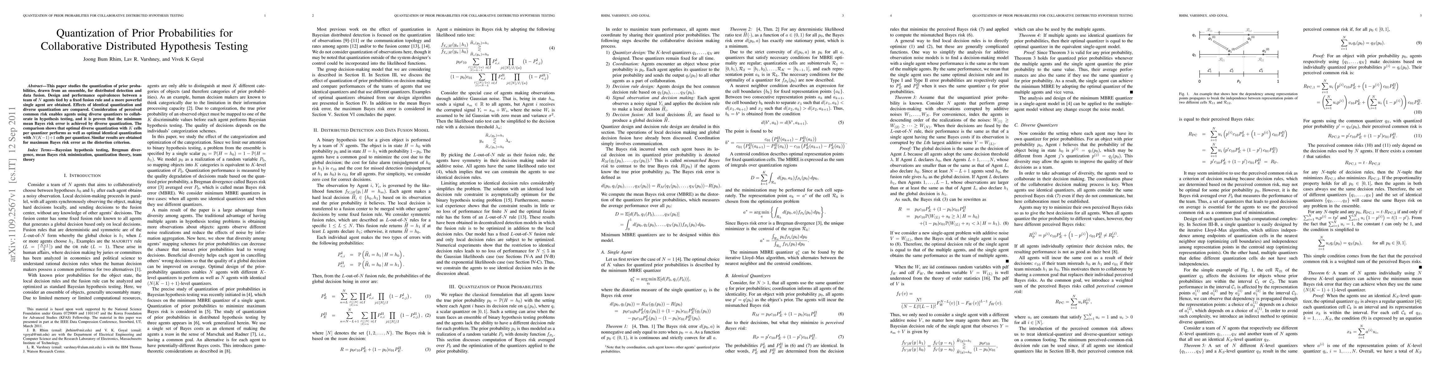 This paper investigates the quantization of prior probabilities for distributed hypothesis testing, comparing the performance of a team of agents versus a single agent under identical and diverse quantization. It demonstrates that diverse quantization achieves the minimum mean Bayes risk error, with optimal diverse quantization matching the performance of identical quantization with more cells.