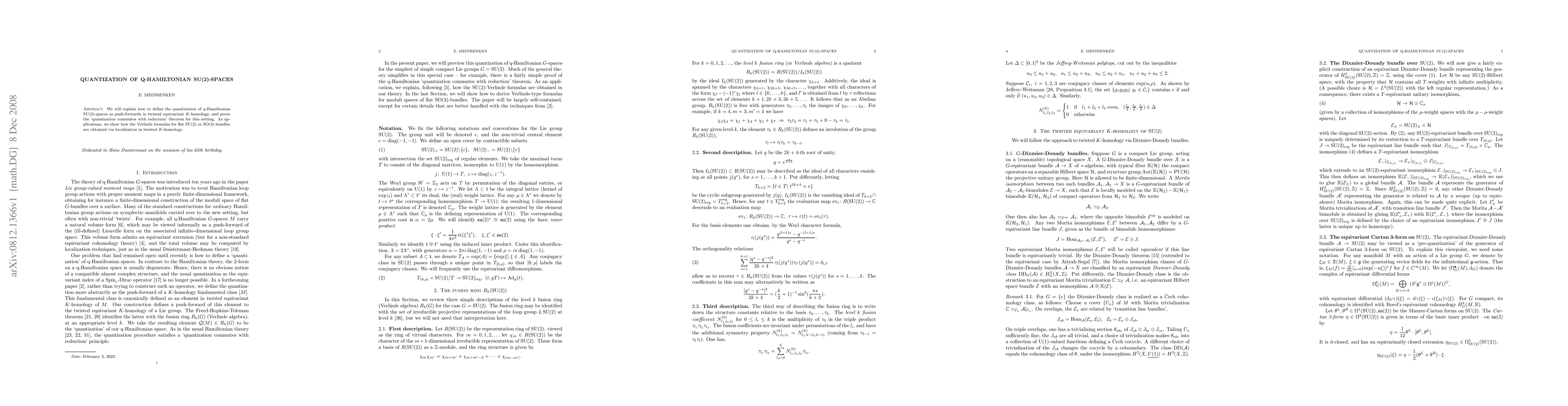 This paper defines the quantization of q-Hamiltonian SU(2)-spaces via push-forwards in twisted K-homology, proving that quantization commutes with reduction. It also demonstrates the derivation of Verlinde formulas for flat SU(2) or SO(3) bundles through localization in twisted K-homology.