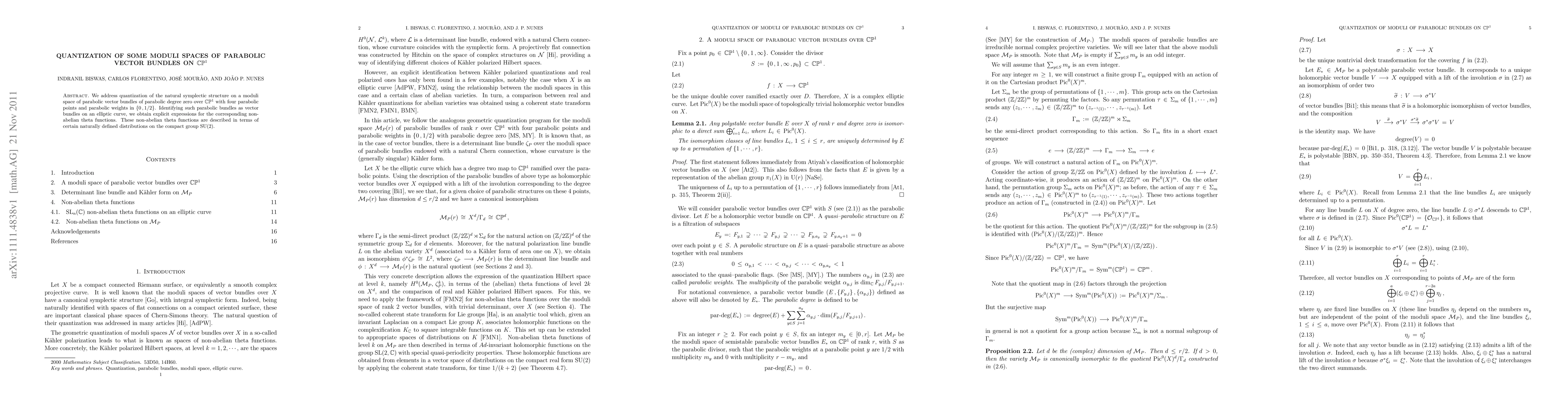 The paper quantizes the natural symplectic structure on a moduli space of parabolic vector bundles over $\mathbf{CP}^1$, deriving explicit non-abelian theta functions through their relation to distributions on the compact group SU(2). The study identifies these bundles as vector bundles on an elliptic curve.