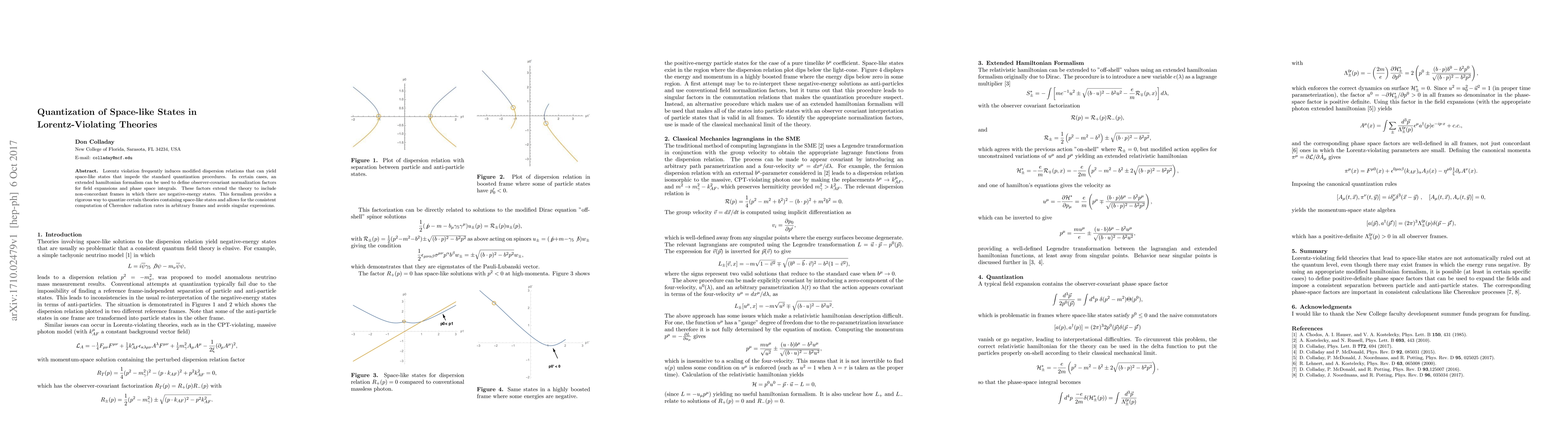 Lorentz violation frequently induces modified dispersion relations that can yield space-like states that impede the standard quantization procedures. In certain cases, an extended hamiltonian formalism can be used to define observer-covariant normalization factors for field expansions and phase space integrals. These factors extend the theory to include non-concordant frames in which there are negative-energy states. This formalism provides a rigorous way to quantize certain theories containing space-like states and allows for the consistent computation of Cherenkov radiation rates in arbitrary frames and avoids singular expressions.