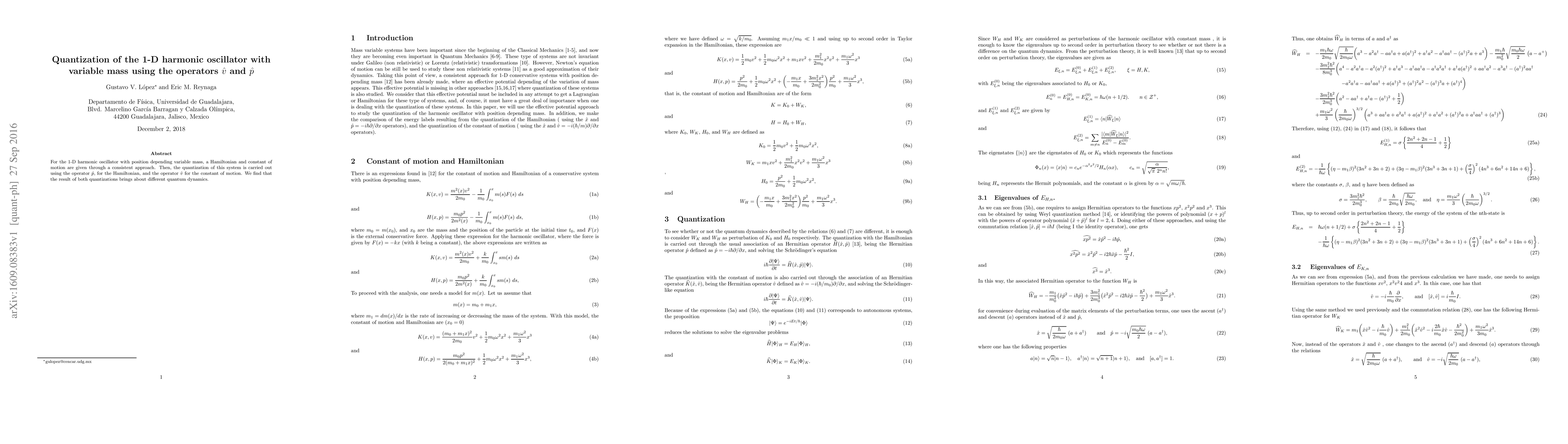This paper quantizes a 1-D harmonic oscillator with a variable mass using operators $\hat p$ and $\hat v$, revealing distinct quantum dynamics from the quantizations applied to the Hamiltonian and constant of motion respectively.