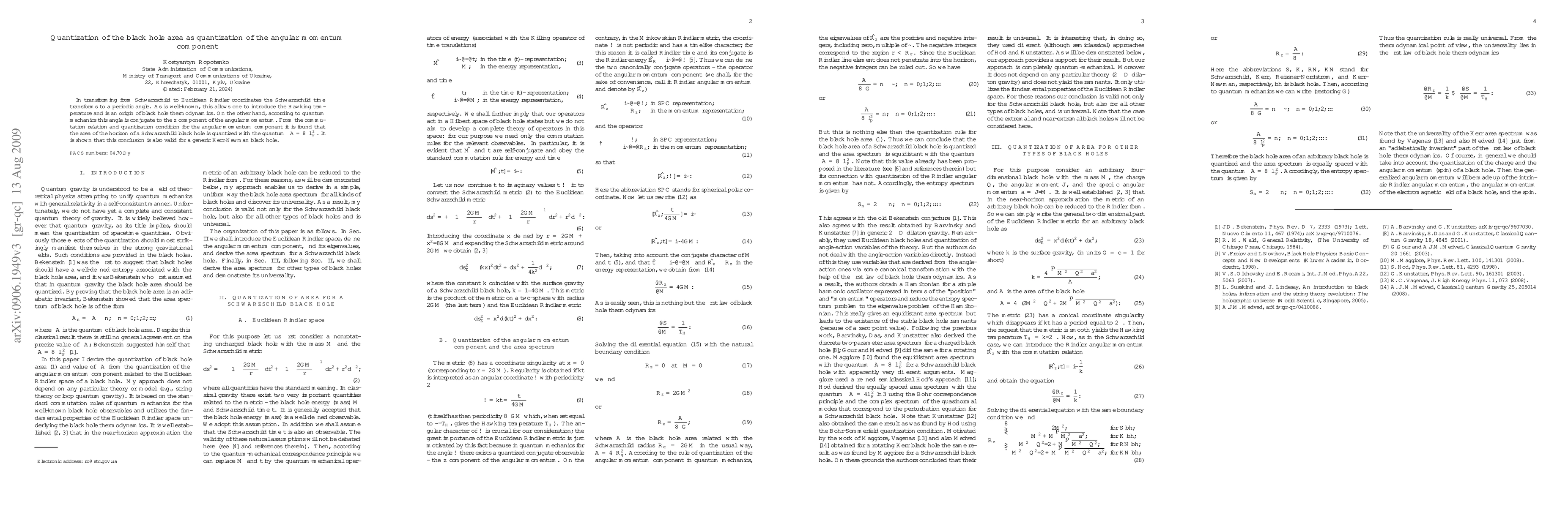 Research finds that the area of a black hole's horizon is quantized with a quantum uncertainty of 8π l_P^2, related to angular momentum in quantum mechanics.