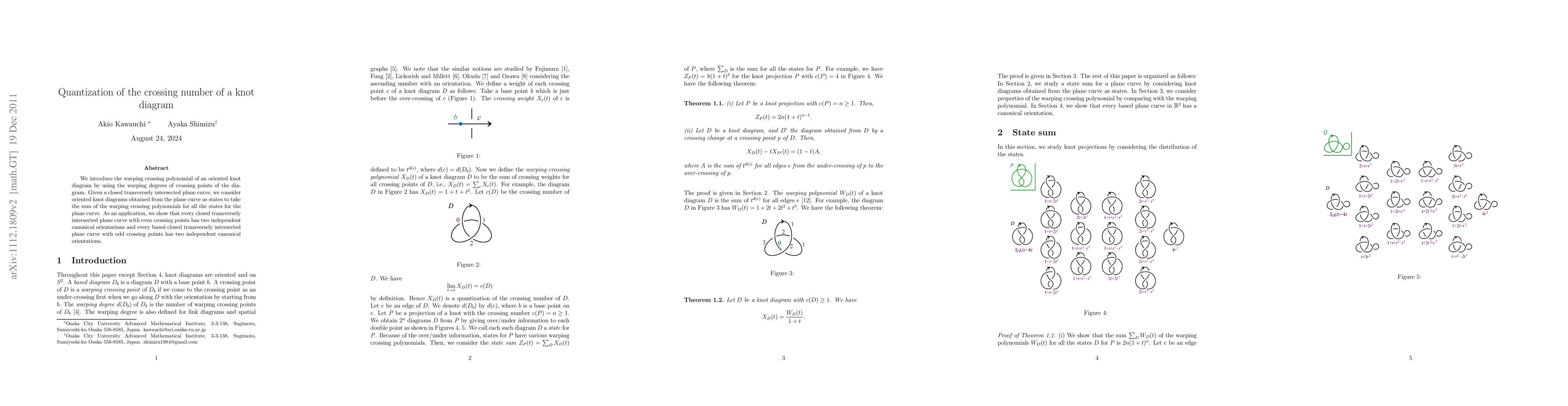 We introduce the warping crossing polynomial of an oriented knot diagram by using the warping degrees of crossing points of the diagram. Given a closed transversely intersected plane curve, we consider oriented knot diagrams obtained from the plane curve as states to take the sum of the warping crossing polynomials for all the states for the plane curve. As an application, we show that every closed transversely intersected plane curve with even crossing points has two independent canonical orientations and every based closed transversely intersected plane curve with odd crossing points has two independent canonical orientations.